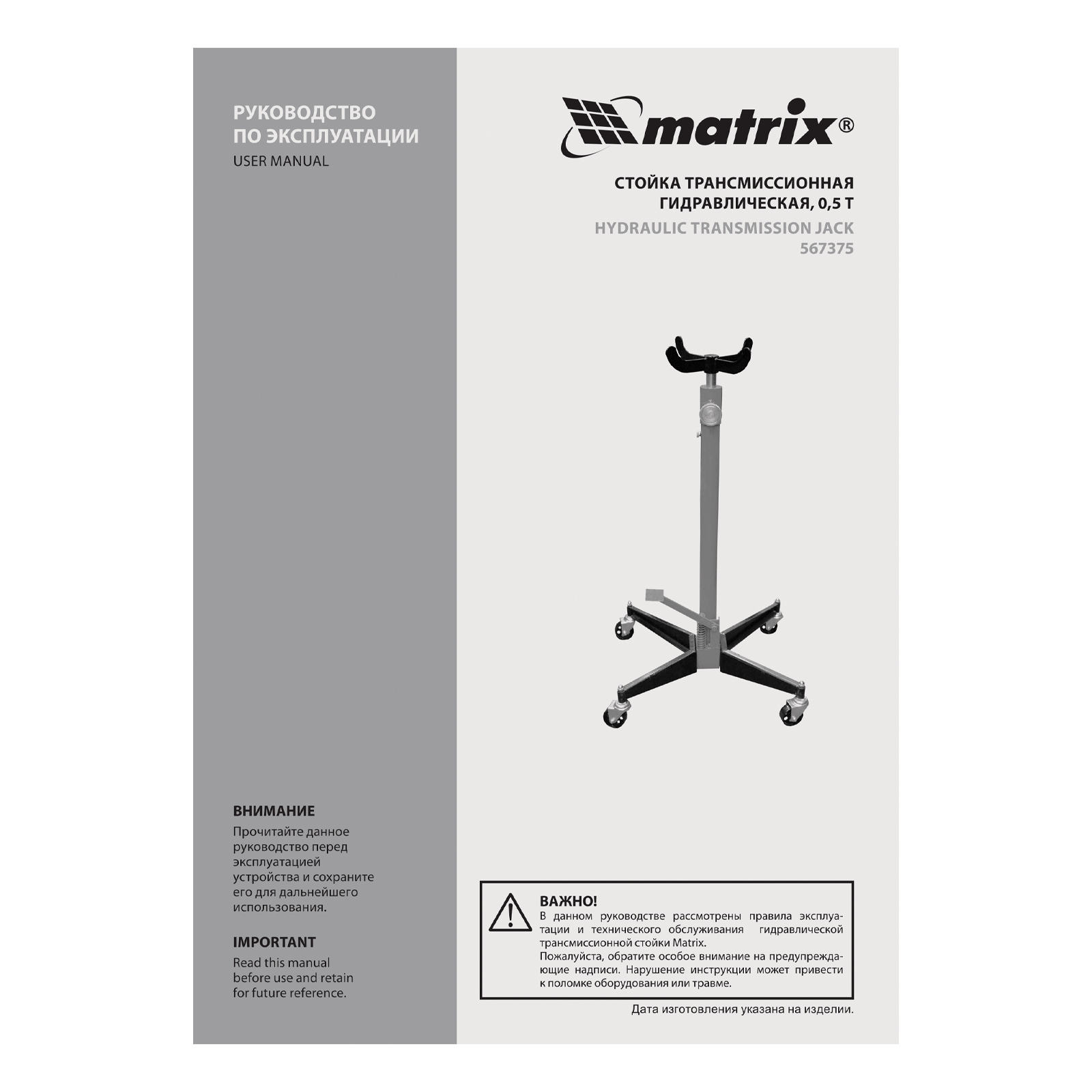 Стойка трансмиссионная гидравлическая, 0.5 т, H подъема 1130-1945 мм Matrix в Екатеринбурге