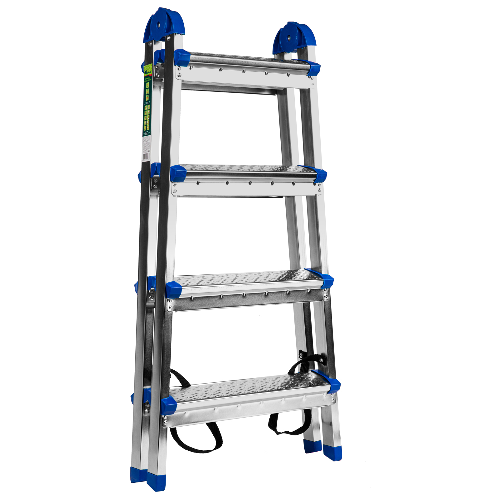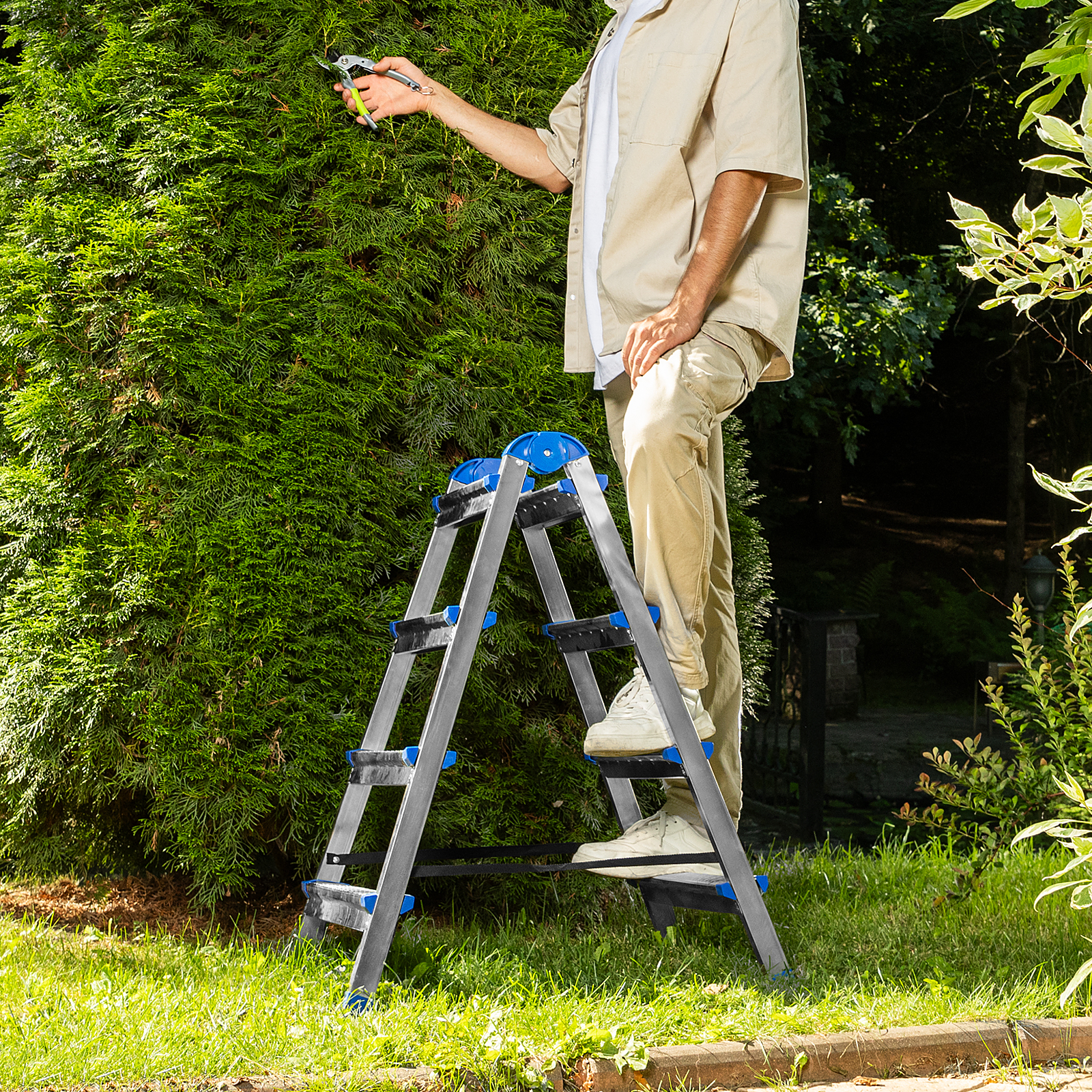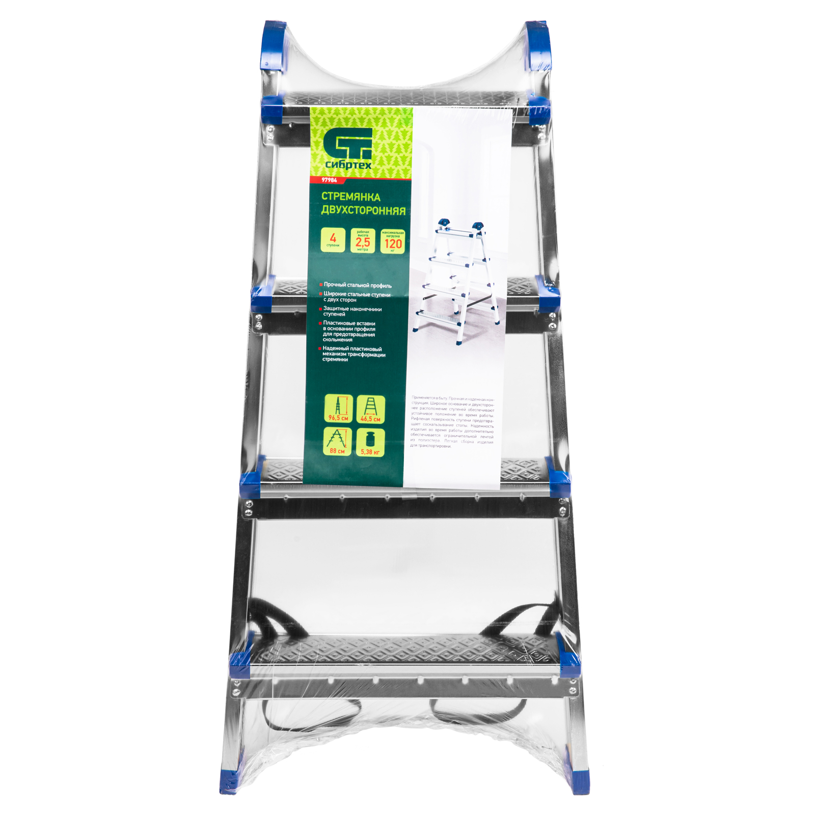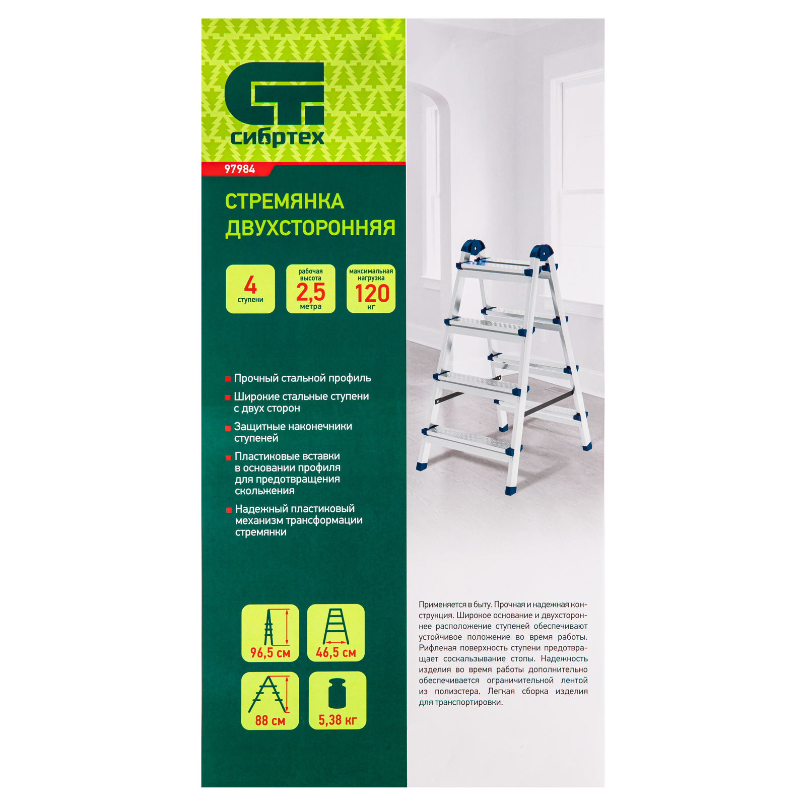 Стремянка двухсторонняя Сибртех 97984 со стальным профилем и 4 стальными ступенями помогает решать бытовые задачи на высоте, превышающей человеческий рост. Ее используют, чтобы доставать предметы с антресолей или шкафов, проводить уборку, менять лампочки, вешать полки или картины. Работать с электроинструментом на ней не рекомендуется. Стремянка с пластиковым складным механизмом повышенной стабильности и широким основанием очень устойчива на ровной поверхности. Площадка находится на высоте 88 см от опорной поверхности, рабочая высота стремянки составляет 288 см (при среднем росте пользователя 170 см).