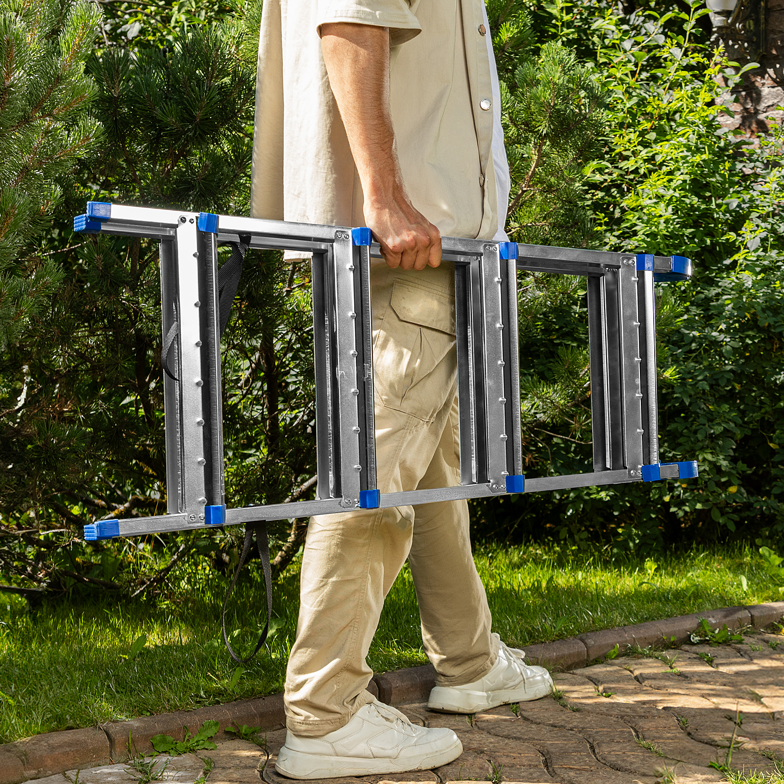 - Удобная транспортировка — стремянка весом 5,5 кг легко складывается, ее размеры в сложенном состоянии 965 х 465 х 160 мм.