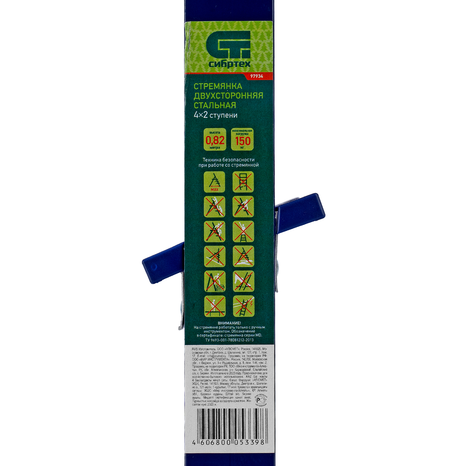 Стремянка двусторонняя стальная Сибртех 97934 с 4 ступенями используется строителями, работниками коммунальных служб, а также полезна в быту. Незаменима, если нужно выполнить монтажные или отделочные работы на высоте, провести уборку, а также достать нужные предметы с антресолей или верхней полки шкафа. На широких ступенях комфортно стоять. Площадка находится на высоте 82,8 см от опорной поверхности, рабочая высота стремянки составляет 282,8 см (при среднем росте пользователя 170 см). Стальная рама прямоугольного сечения выдерживает нагрузку до 150 кг.