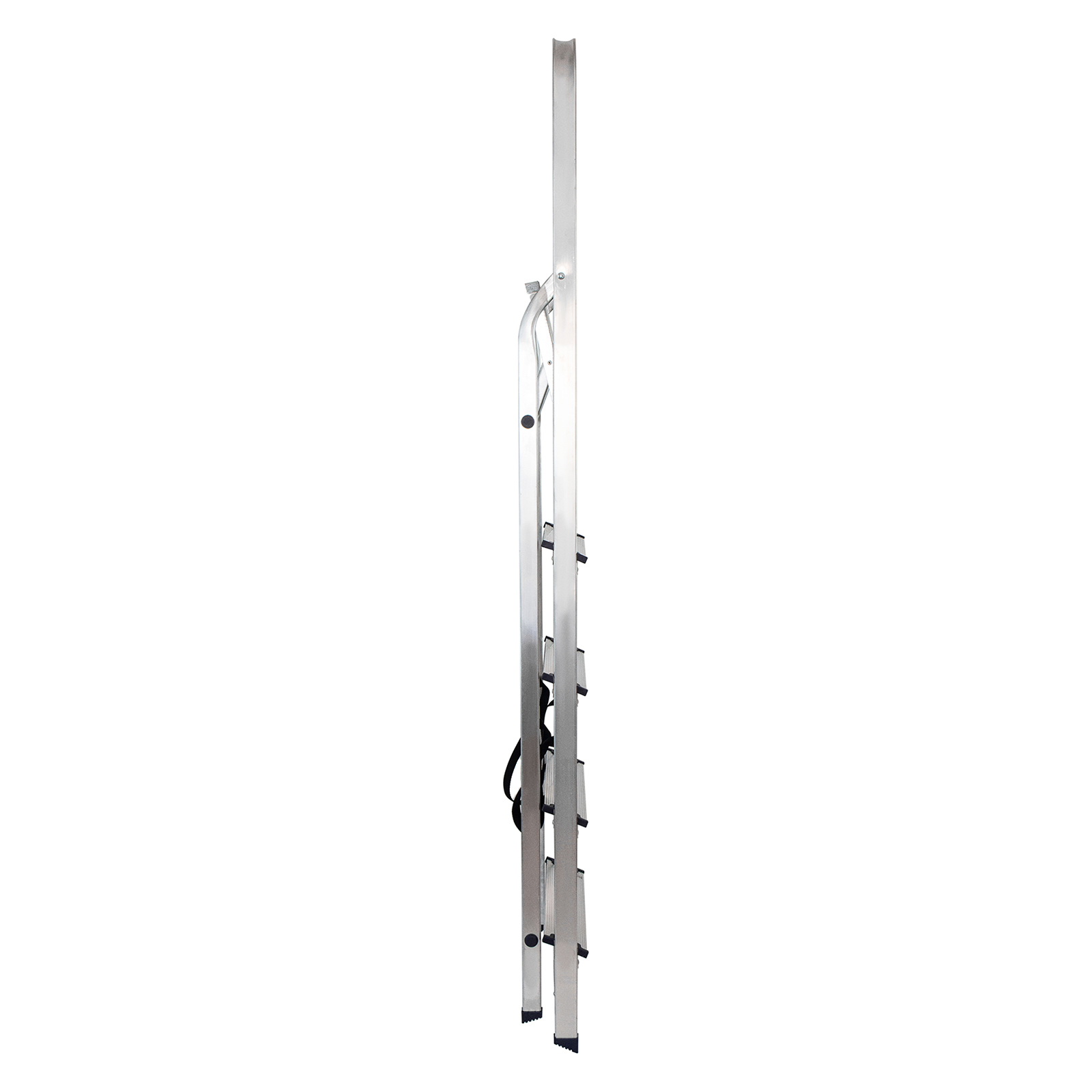 - Надежность — рама из прямоугольного алюминиевого профиля выдерживает нагрузку до 150 кг, широкие ступени закреплены заклепками, страховочные стяжки повышают прочность конструкции.