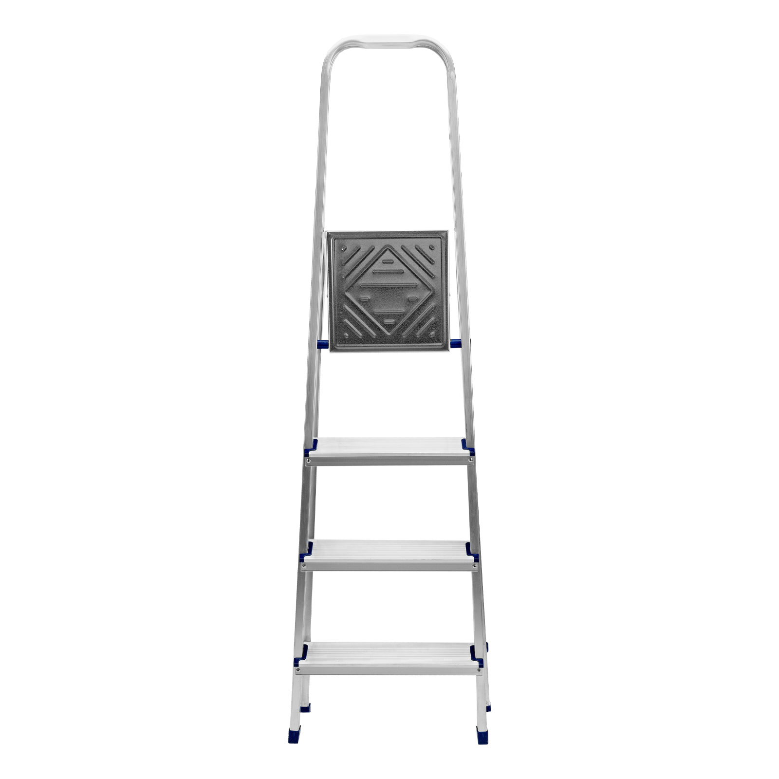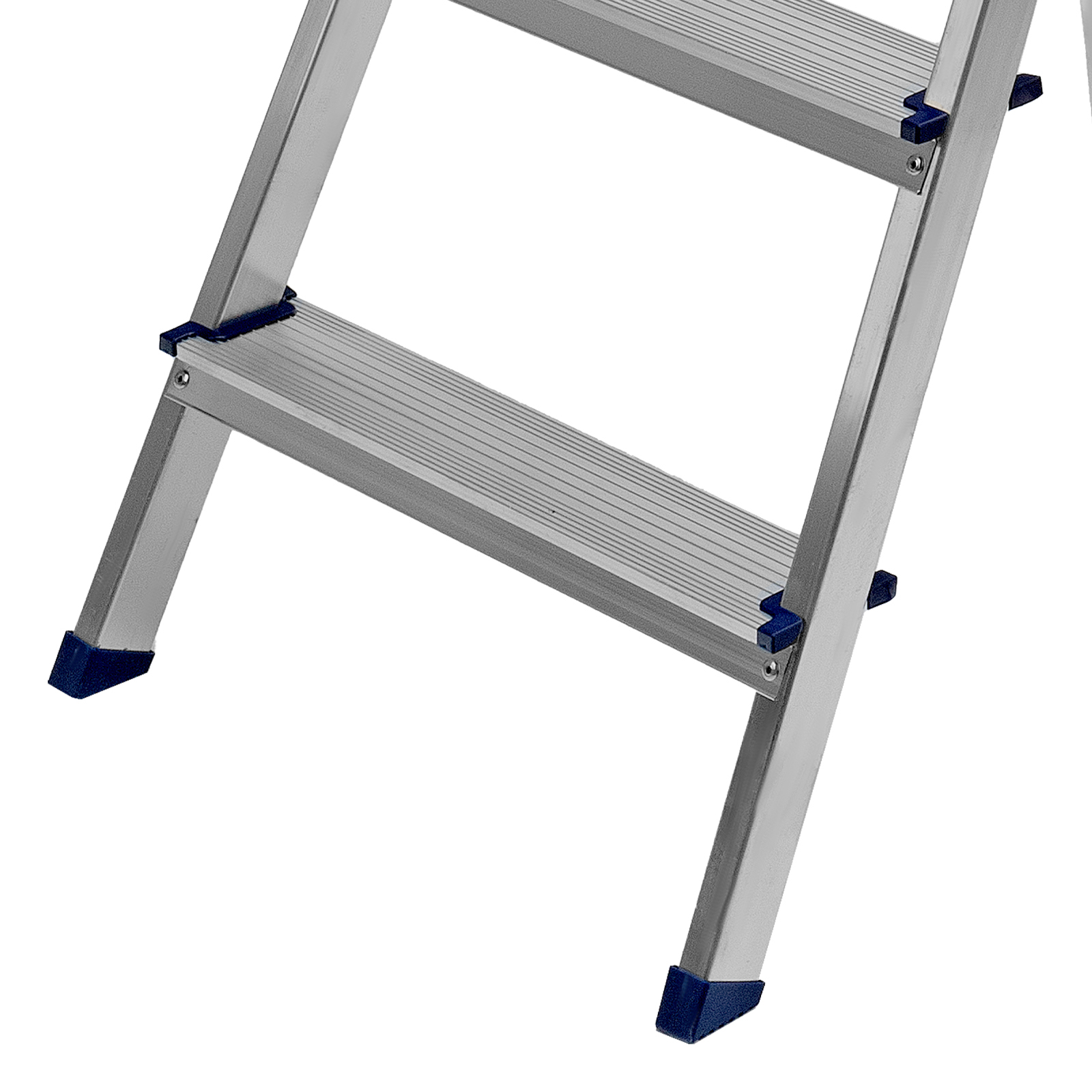 - Надежность — рама из прямоугольного алюминиевого профиля выдерживает нагрузку до 150 кг, широкие ступени закреплены заклепками.