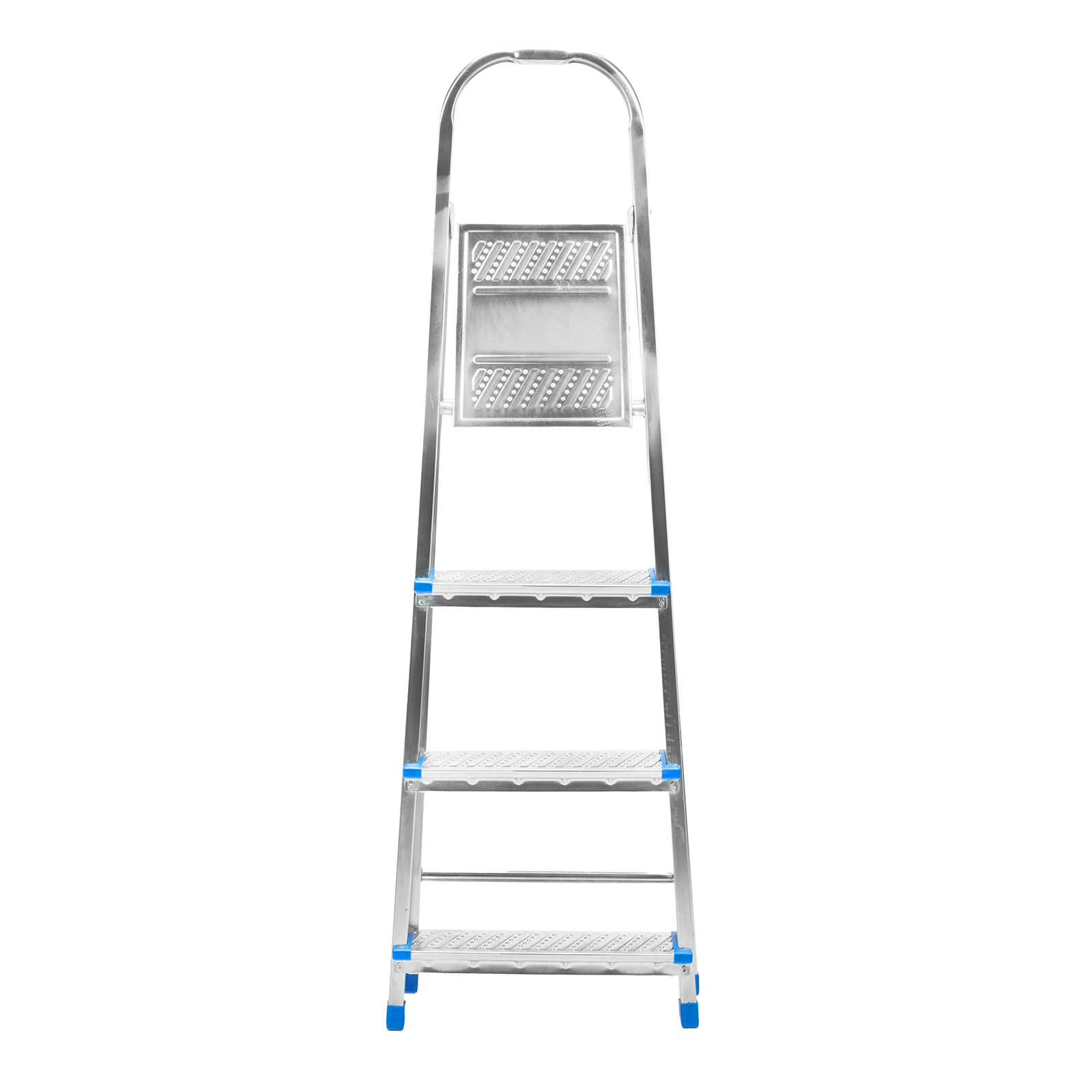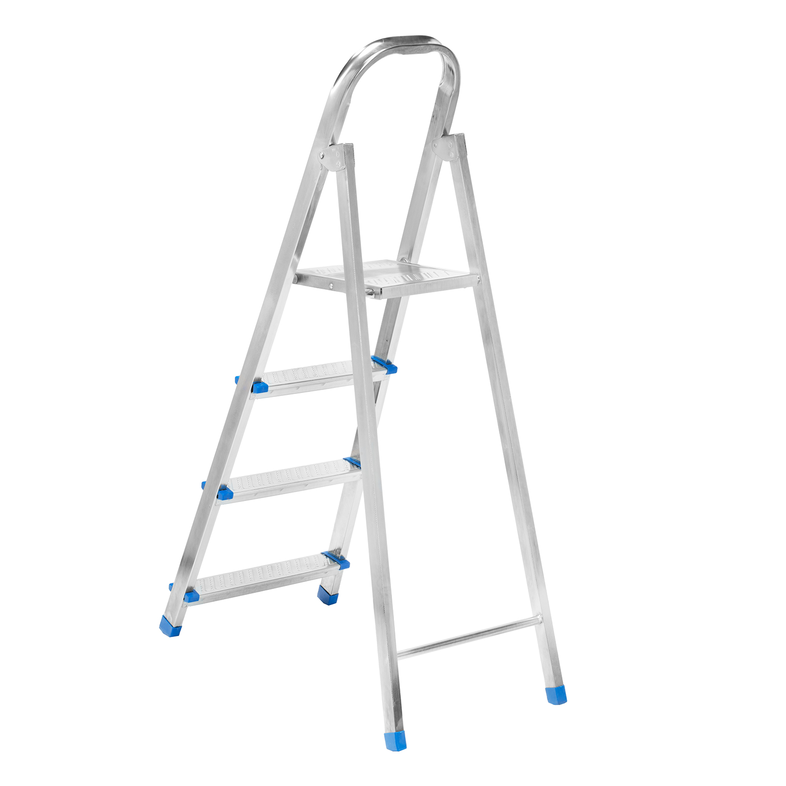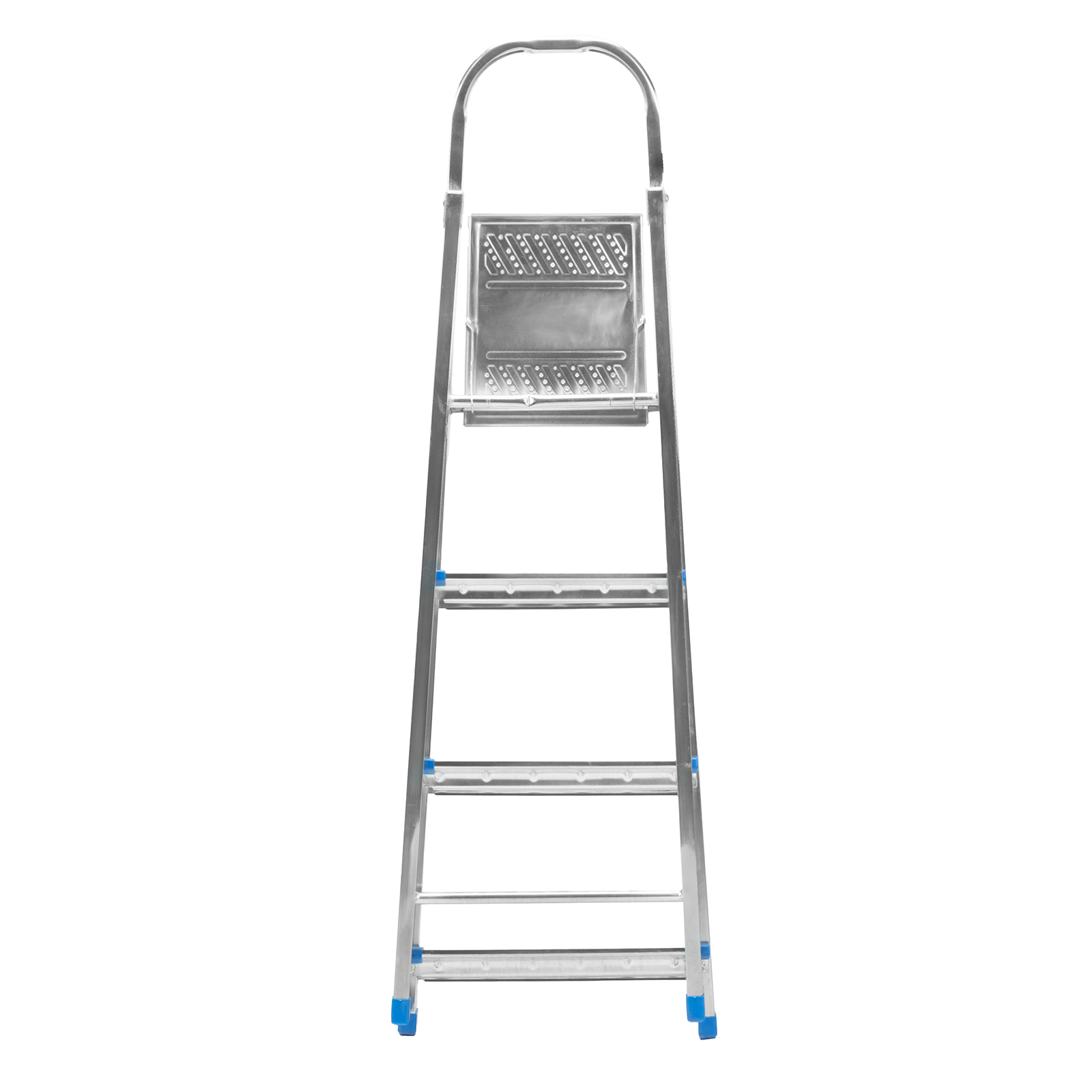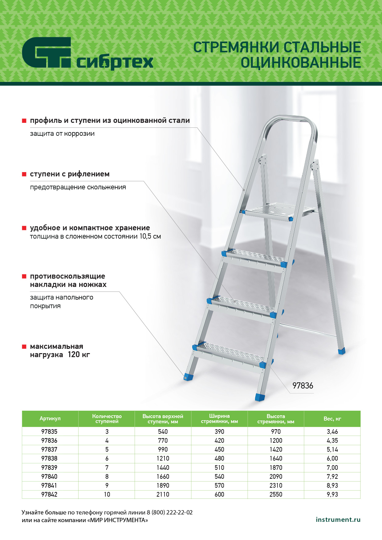 Стальная оцинкованная стремянка Сибртех 97836 с 4 ступенями позволяет повесить полку, картину или шкафчик, достать нужный предмет и решить другие задачи, для которых требуется доступ к предметам на высоте. Рама и ступени из стального профиля выдерживают вес до 120 кг. Расстояние от опорной поверхности до площадки составляет 76,5 см, при среднем росте пользователя 170 см рабочая высота лестницы — 276,5 см. Необходимо соблюдать технику безопасности: размещать стремянку только на ровной плоскости и не использовать ее для работы с дрелью, шуруповертом и другим электроинструментом.