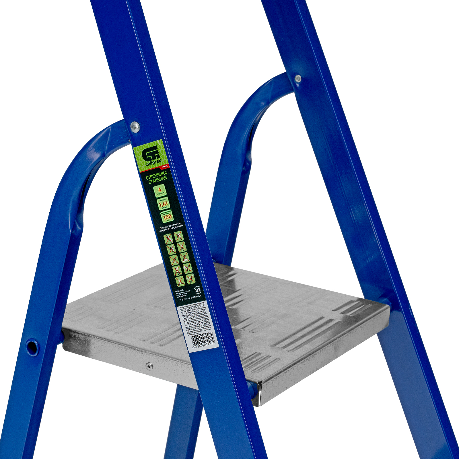 - Надежная конструкция — рама изготовлена из профилированной стали, стальная верхняя площадка с зацепами прочно фиксирует стремянку в рабочем положении.