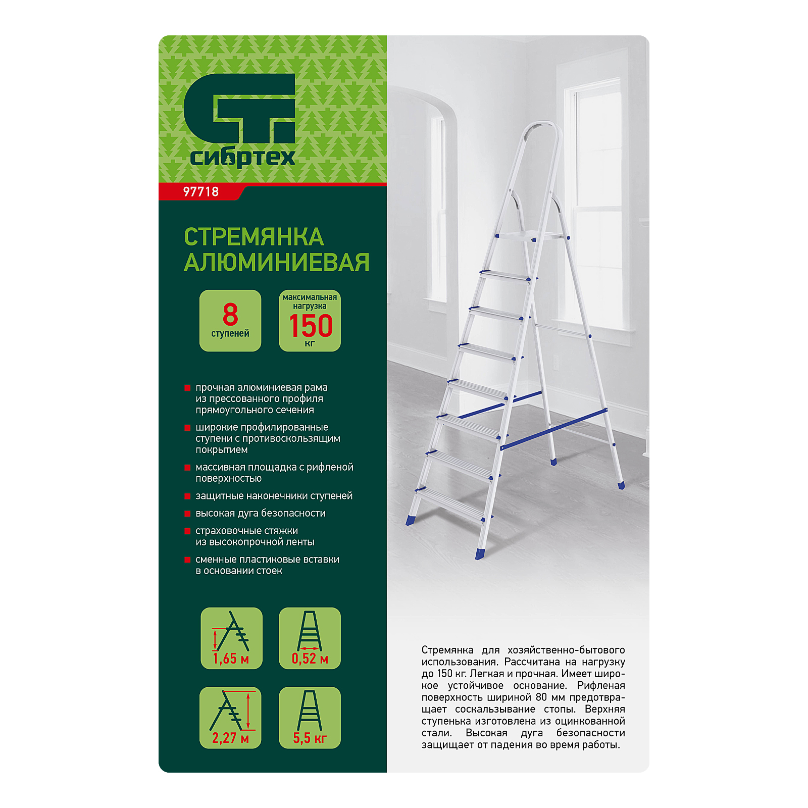 Стремянка алюминиевая Сибртех 97718 с 8 ступенями предназначена для выполнения работ на высоте, превышающей человеческий рост. Высокая дуга безопасности обеспечивает устойчивое положение пользователя. Площадка находится на высоте 165,7 см от опорной поверхности, рабочая высота стремянки составляет 365,7 см (при среднем росте пользователя 170 см). Стремянка пригодится во время строительных и ремонтных работ, будет полезна на даче или в гараже.