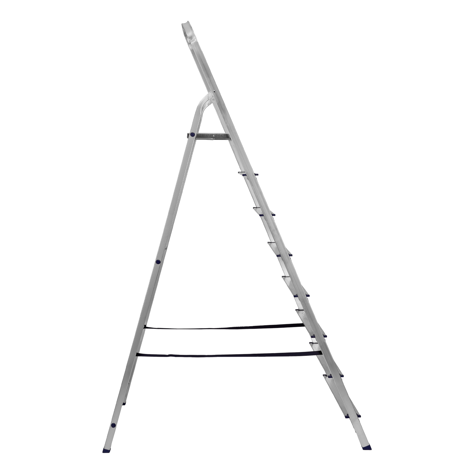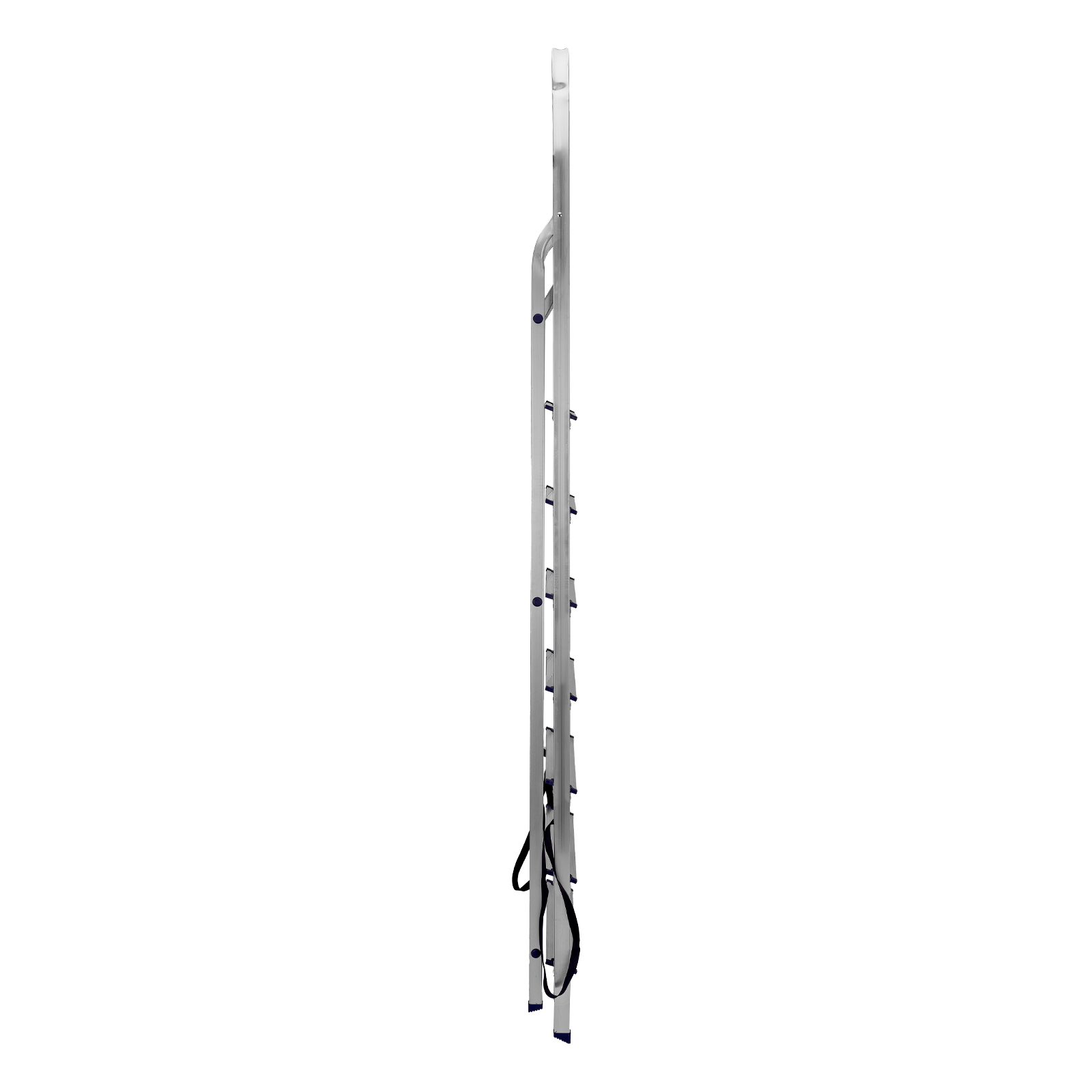 - Надежность — рама из прямоугольного алюминиевого профиля выдерживает нагрузку до 150 кг, широкие ступени закреплены заклепками, страховочные стяжки повышают прочность конструкции.