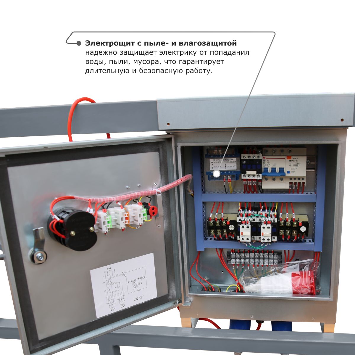 - Электрощит с пыле- и влагозащитой надежно защищает электрику от попадания воды, пыли, мусора, что гарантирует длительную и безопасную работу.