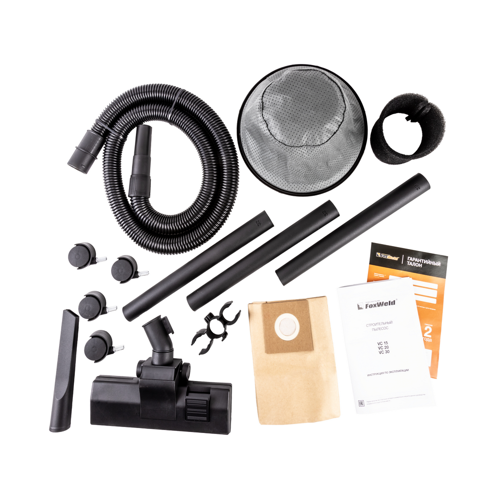 Строительный пылесос FOXWELD VC-15 отлично подходит для уборки после проведения ремонтных и строительных работ. Модель VC-15 используется для сбора сухого и влажного мусора. Это могут быть не только бытовые загрязнения, но и пыль класса М – частицы извести, мела, пыль от меди, жести, никеля, древесины. Мощная функция обдува позволяет очистить рабочее место от опилок, стружки, строительной пыли, сдуть листву с дорожек и даже прочистить водосток или канализацию. Строительный пылесос также позволяет эффективно собирать негорючую жидкость с любой поверхности, а щелевая насадка облегчает уборку узких участков.СБОР НЕГОРЮЧЕЙ ЖИДКОСТИ: Специальная функция сбора жидкости предназначена для эффективной уборки растворов, суспензий и воды с любой поверхности.ФУНКЦИЯ ОБДУВА: Функция обдува позволяет очистить рабочее место и поверхности от опилок, стружки, строительной пыли, сдуть листву с дорожек, прочистить водосток или канализацию.КОНТРОЛЬ ЗАПОЛНЕНИЯ КОНТЕЙНЕРА: На определённом уровне заполнения бака происходит автоматическая остановка всасывания для предотвращения попадания жидкости, грязи, пыли и другого мусора в двигатель пылесоса.КРОНШТЕЙН ДЛЯ КРЕПЛЕНИЯ АКСЕССУАРОВ: Шланг с трубой или составные части трубы можно быстро и легко закрепить на корпусе пылесоса в процессе уборки или для длительного хранения с помощью специального съёмного кронштейна.ПРЕИМУЩЕСТВА:Губчатый фильтр и мешок-пылесборник уже установлены в пылесосеГубчатый (поролоновый) фильтр защищает двигатель пылесоса от загрязнения и влаги в виде капель и пены при влажной уборкеТканевый промежуточный фильтр увеличенной площади улучшает фильтрацию воздушного потока и снижает нагрузку на остальные элементы фильтрующей системыМешок-пылесборник для сухой уборки обеспечивает дополнительный уровень очисткиВсе аксессуары можно хранить непосредственно на самом пылесосе – насадки вставляются в специальные отверстия на корпусеСпециальные крепления на корпусе для фиксации кабеля, предотвращающие его спутывание во время храненияПластиковый бак не подвержен коррозии и устойчив к механическим воздействиямТрёхсекционная пластиковая трубаЩётка «пол/ковёр» с клавишей переключенияЩелевая насадка для сбора пыли в труднодоступных местахФУНКЦИОНАЛЬНЫЕ ОСОБЕННОСТИ:ГУБЧАТЫЙ ФИЛЬТР: Дополнительный губчатый фильтр защищает двигатель пылесоса от загрязнения и попадания в него брызг во время всасывания жидкостей.КОМПЛЕКТАЦИЯ: Строительный пылесос VC 15 – 1 шт.; Всасывающий пластиковый шланг – 1 шт.; Всасывающая труба – 3 шт.; Щётка «пол/ковёр» с клавишей переключения – 1 шт.; Щелевая насадка – 1 шт.; Кронштейн для крепления аксессуаров – 1 шт.; Колёса – 4 шт.; Бумажный мешок – 1 шт.; Инструкция + Гарантийный талон – 1 компл.*Производитель оставляет за собой право менять комплектацию оборудования.