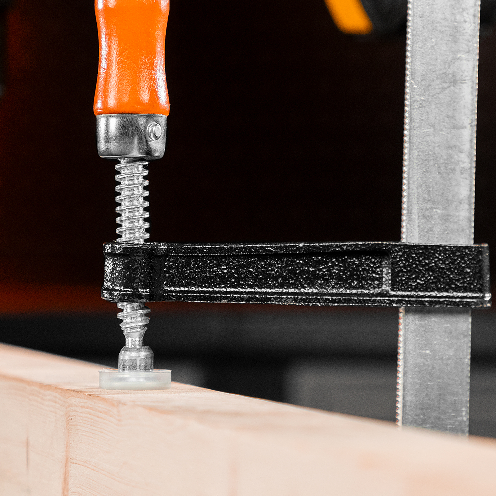 F-образная струбцина Sparta 204385 длиной 365 мм и величиной зажима 300 х 120 мм позволяет фиксировать заготовки из металла, древесины и других материалов для их соединения или обработки. Используется в столярном и слесарном деле. Деталь помещают между губками, одна из которых подвижна и служит для регулировки величины захвата. Винтовой зажим позволяет фиксировать заготовку со значительным усилием. Элементы конструкции выдерживают высокую температуру, поэтому струбцина подходит для проведения сварочных работ, при этом пластиковые накладки необходимо снять.