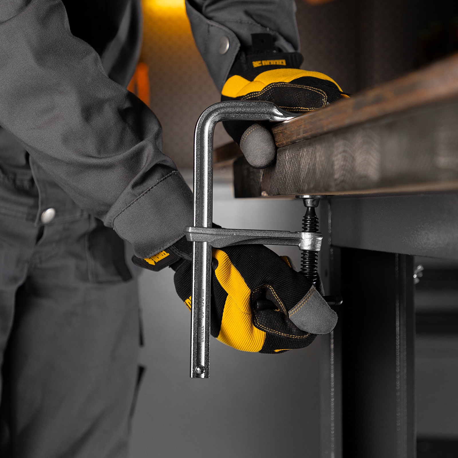 Кованая F-образная струбцина Denzel 20464 с глубиной зажима 80 мм, усиленная, предназначена для фиксации деталей шириной до 150 мм и материалов при проведении слесарных, столярных и сварочных работ. Тавровый профиль обеспечивает устойчивость конструкции к изгибу, что позволяет фиксировать детали со значительным усилием. Струбцина подходит для профессионального применения.