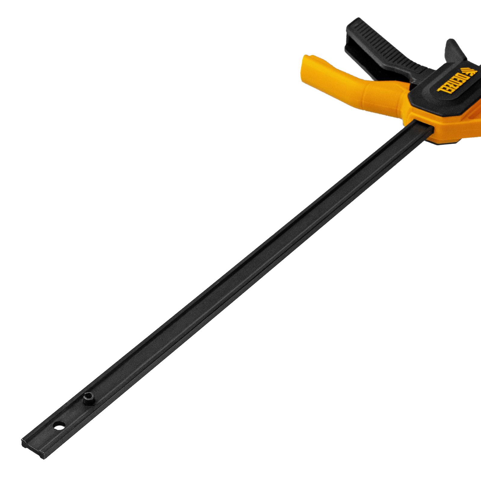- Комфортное использование — струбцина весит всего 360 г, обрезиненная кнопка фиксации обеспечивает удобный захват.