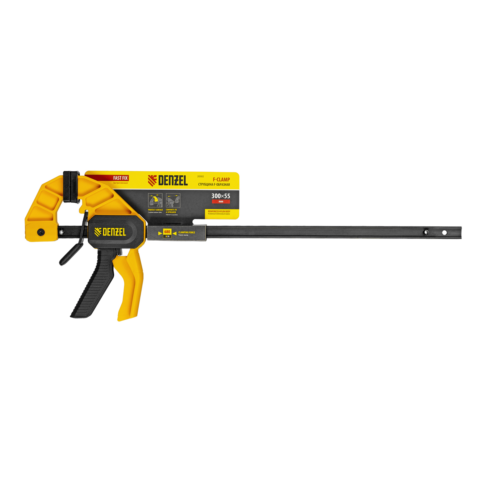 Струбцина F-образная быстрозажимная Denzel 20502 с пошаговым зажимом шириной 300 мм и глубиной 55 мм, с усиленным нейлоновым корпусом, позволяет прочно зафиксировать детали для их обработки, склеивания и выполнения других задач. Сила сжатия составляет 680 Н. Струбцина подходит для бытового и профессионального применения.