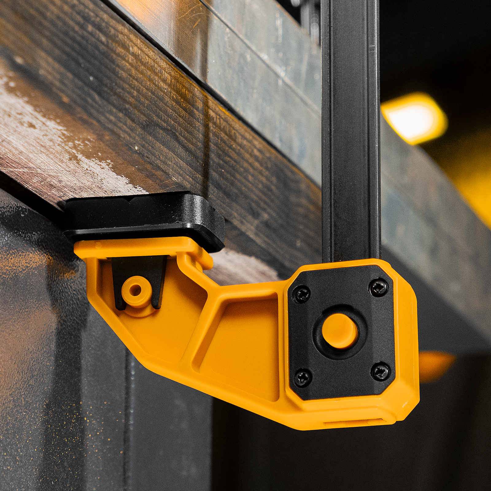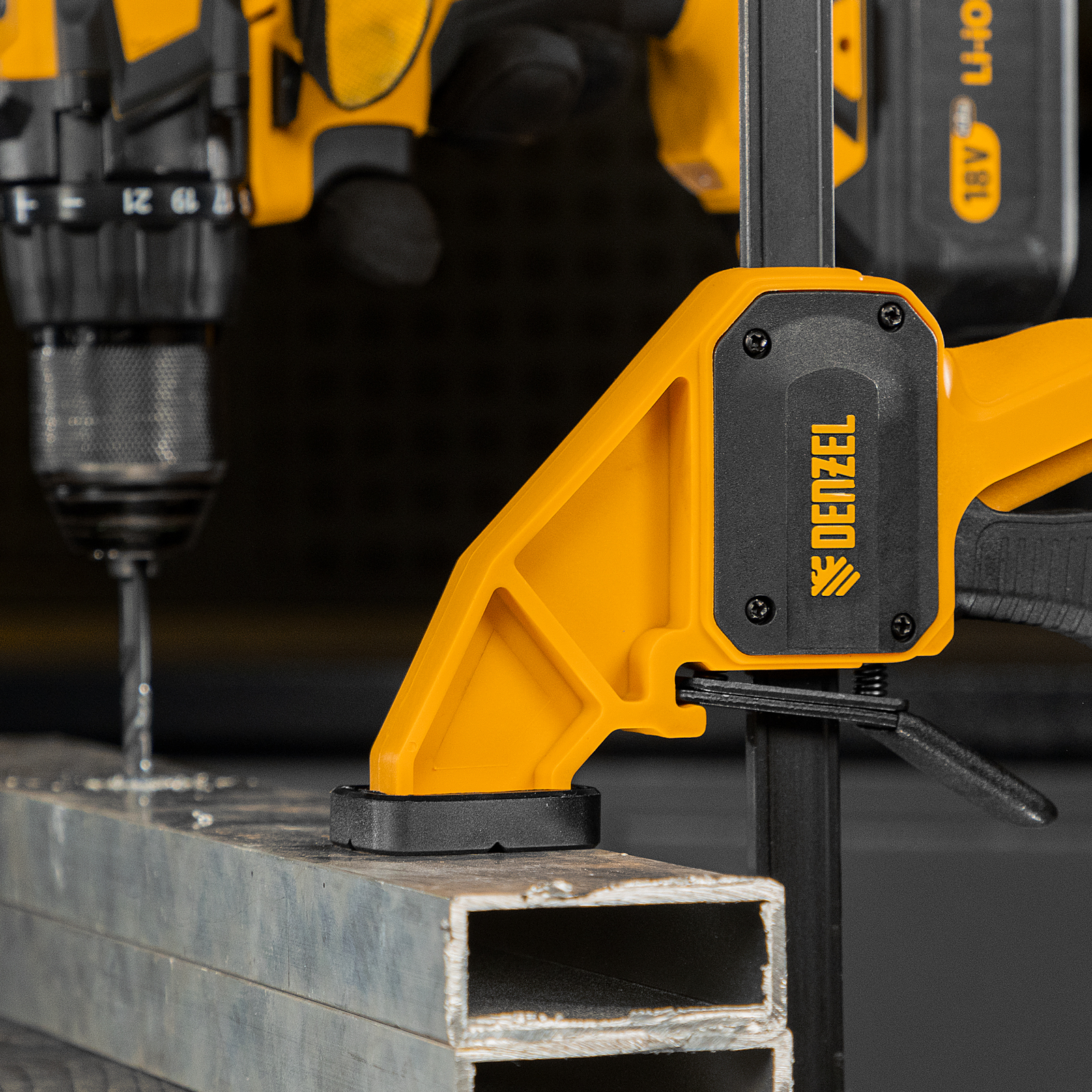 - Комфортное использование — струбцина весит всего 710 г, обрезиненная кнопка фиксации обеспечивает удобный захват.