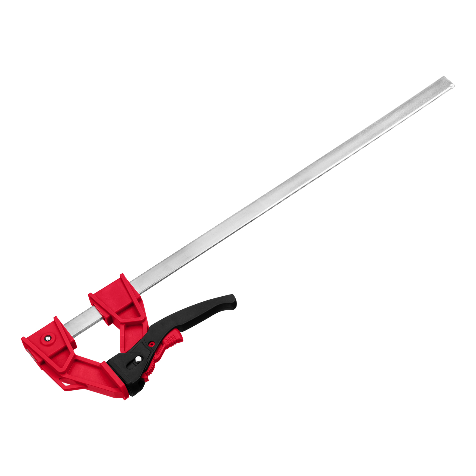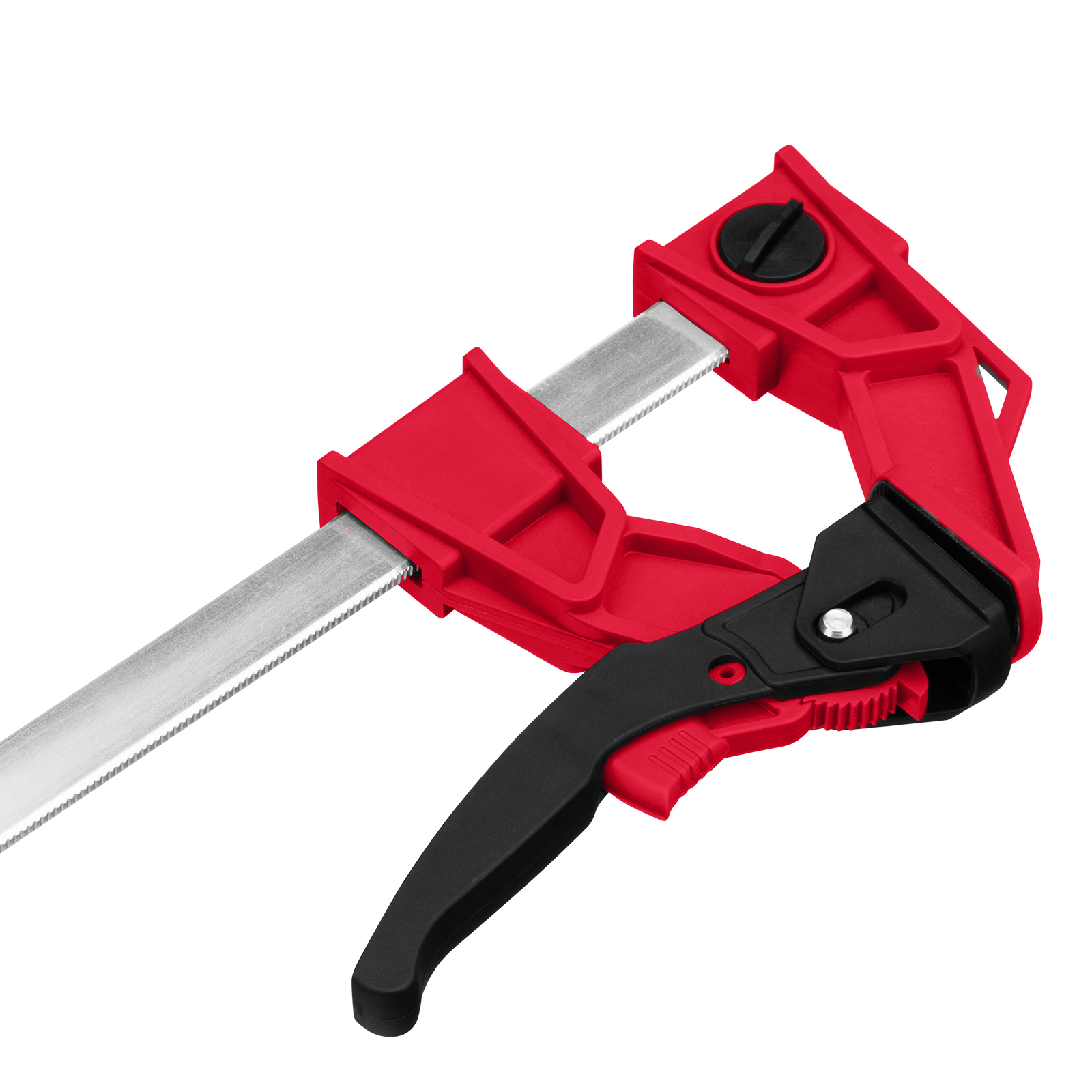 - Дополнительные возможности — съемную неподвижную губку можно перевернуть на рейке, превратив струбцину в распорный инструмент.