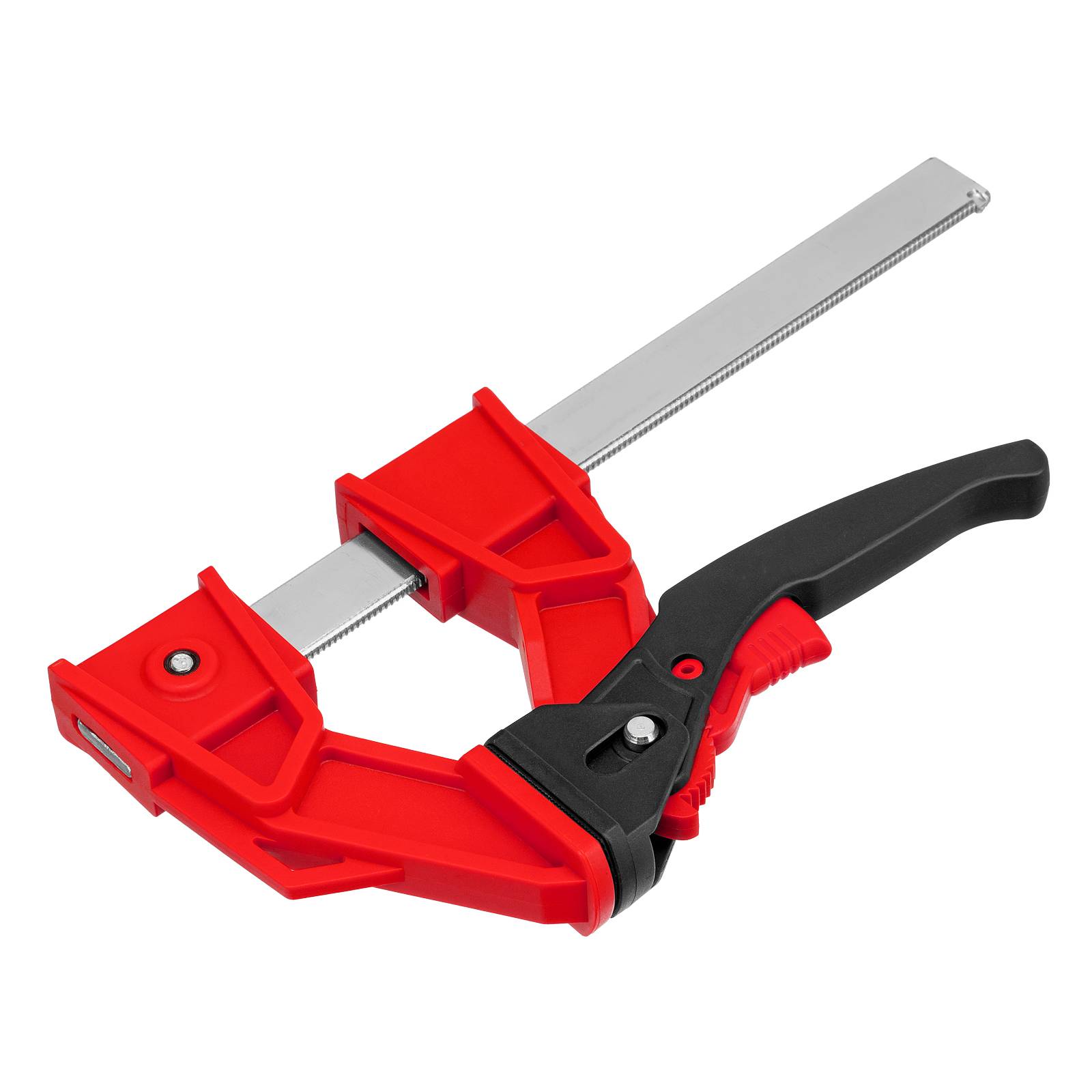 - Дополнительные возможности — съемную неподвижную губку можно перевернуть на рейке, превратив струбцину в распорный инструмент.