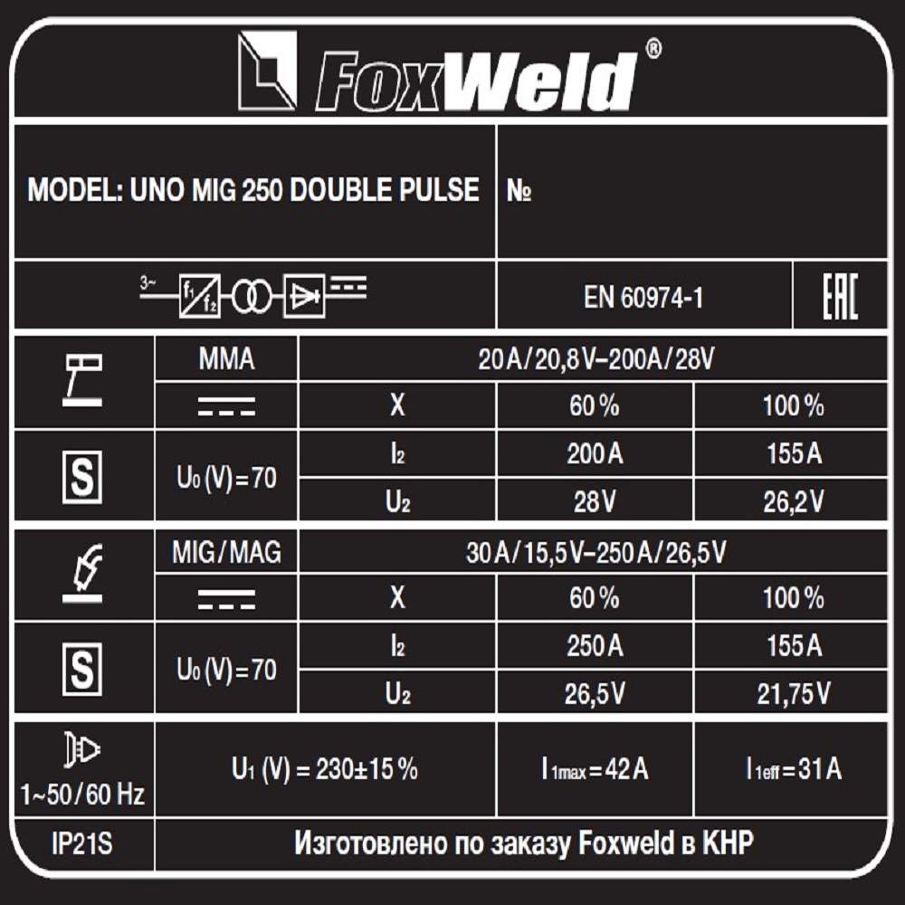 Сварочный полуавтомат UNO MIG 250 DOUBLE PULSE с синергетическим управлением позволяет сваривать изделия из углеродистой и нержавеющей стали, а также алюминия и его сплавов. Данная установка имеет следующие виды сварочного процесса: полуавтоматическая сварка (MIG/МAG), полуавтоматическая сварка в импульсном режиме (PULSE), полуавтоматическая сварка в режиме двойного импульса (DOUBLE PULSE), ручная дуговая сварка штучным электродом с покрытием (ММА). Синергетическая система управления существенно облегчает настройки сварочных параметров. Импульсный режим сварки PULSE представляет из себя управляемый перенос металла без разбрызгивания с высокой концентрацией сварочной дуги и хорошими металлургическими свойствами получаемого соединения. Режим DOUBLE PULSE необходим, чтобы создать достаточный провар и хороший внешний вид сварного шва. Полуавтомат собран на тележке, имеющей площадку для размещения газового баллона. UNO MIG 250 DOUBLE PULSE предназначен для широкого использования в промышленности и в отраслях по производству различных металлоконструкций.РЕЖИМ DOUBLE PULSE: При двойном импульсе скорость подачи проволоки меняется во время сварки в соответствии с заданными параметрами. Режим DOUBLE PULSE идеален для сварки нержавеющей стали и алюминия (также благодаря очищающему воздействию быстрых фронтов переключения), особенно тонких листов, на которых можно добиться уровня качества, равного аргонодуговой сварке (TIG), при этом производительность будет более высокой. В режиме DOUBLE PULSE можно регулировать длительность тока импульса и тока паузы, что позволяет дополнительно управлять внешним видом шва и уменьшать зону термического влияния. Сварка в режиме DOUBLE PULSE упрощает процесс сварки алюминия и его сплавов, а также нержавеющих сталей, обеспечивая высокий уровень надежности соединения.СИНЕРГЕТИЧЕСКИЙ РЕЖИМ УПРАВЛЕНИЯ: Режим синергетики позволяет сэкономить время и получить качественное сварное соединение даже новичку, так как основные параметры подбираются автоматически с возможностью тонкой ручной подстройки сварочного процесса. Синергетику можно отключить для работы в ручном режиме.4-РОЛИКОВЫЙ МЕХАНИЗМ ПОДАЧИ: 4-роликовый механизм подачи сварочной проволоки обеспечивает стабильную подачу присадочного материала, что способствует получению качественного результата. 4 ролика позволяют подавать проволоку в область сварки без рывков и проскальзываний, особенно при использовании длинных сварочных горелок, а также обеспечивают меньшее давление и деформацию сварочной проволоки, что критически важно для качественной и стабильной сварки.ФУНКЦИЯ VRD: Функция VRD (снижение напряжения холостого хода) повышает безопасность и исключает риск поражения сварщика электрическим током. Сварочный процесс становится более безопасным в замкнутых пространствах и при сварке в условиях повышенной влажности.РЕГУЛИРОВКА ИНДУКТИВНОСТИ: С помощью ручной настройки индуктивности можно дополнительно регулировать сварочную дугу для формирования нужного сварного шва. Регулировка индуктивности позволяет вести процесс сварки с минимальным разбрызгиванием металла и приспосабливать процесс к любому типу работ.ПРЕИМУЩЕСТВА:Синергетическая система управления позволяет быстро настроить оборудование под любые задачи4-роликовый полноприводный подающий механизм позволяет ста