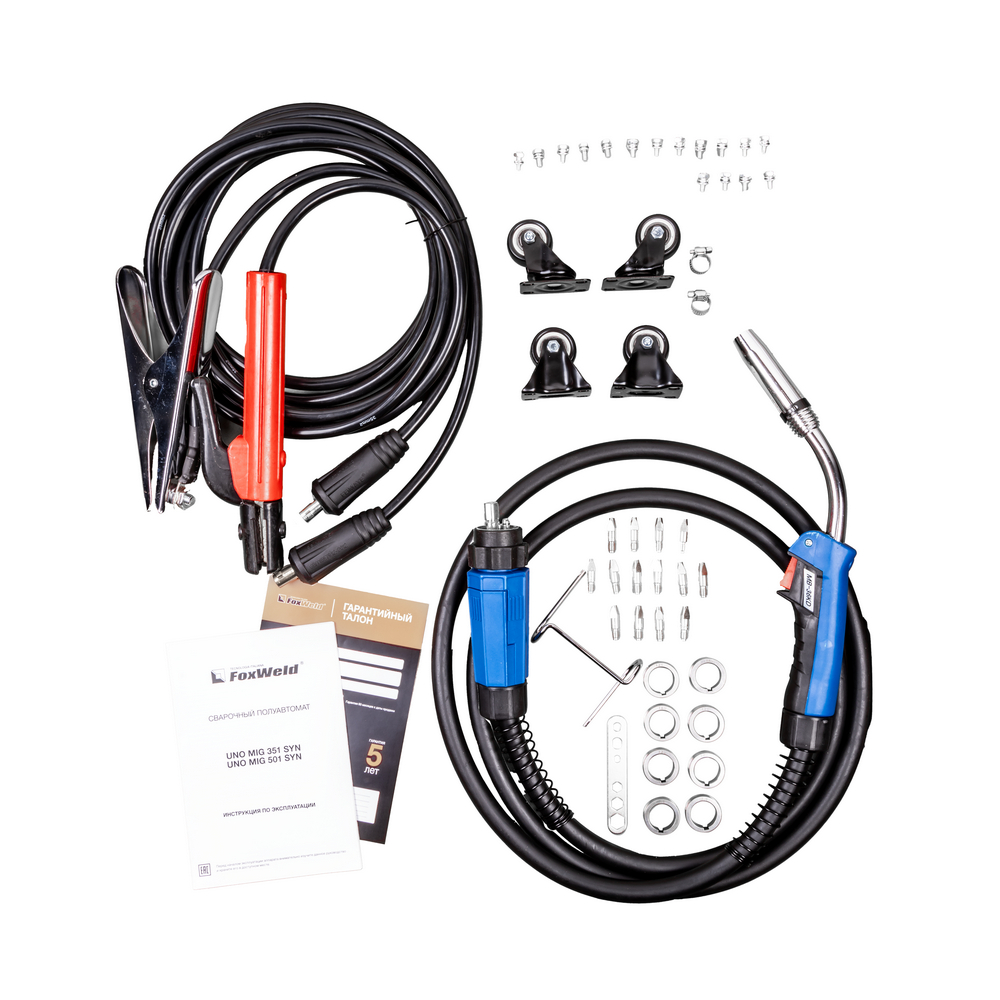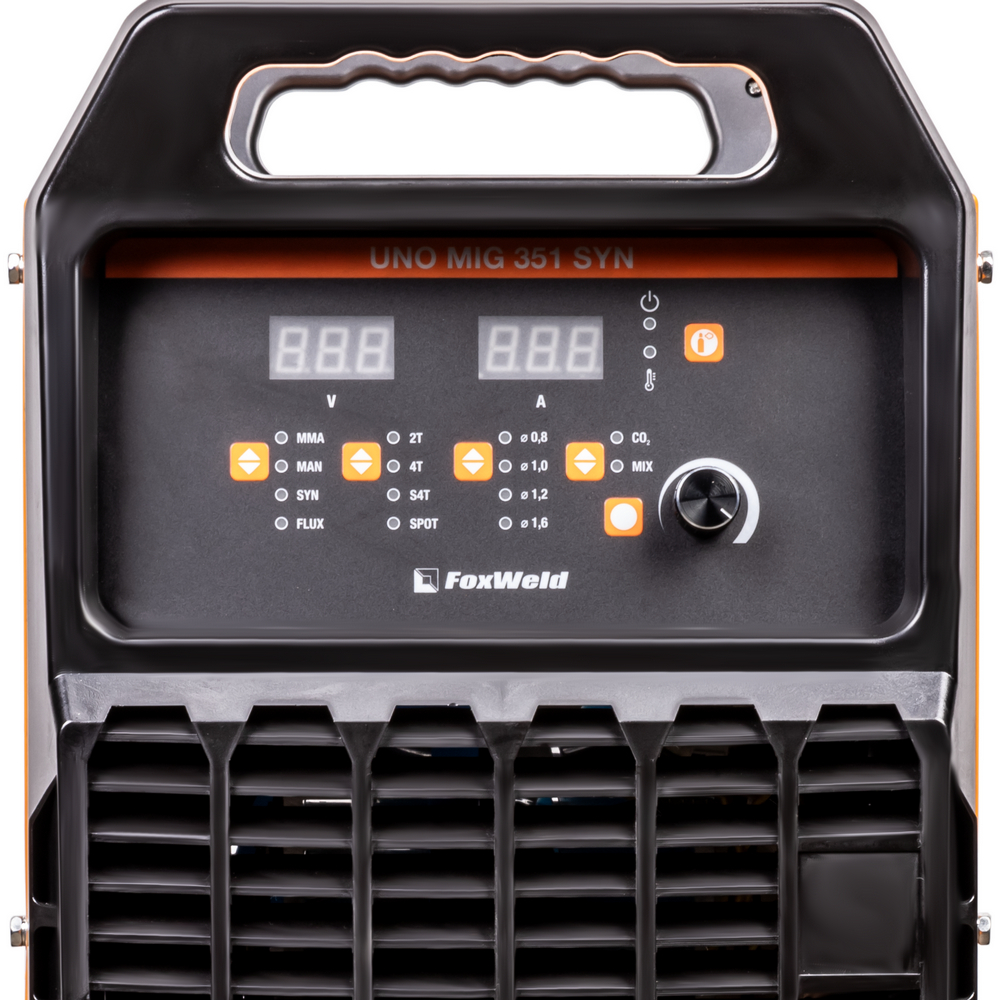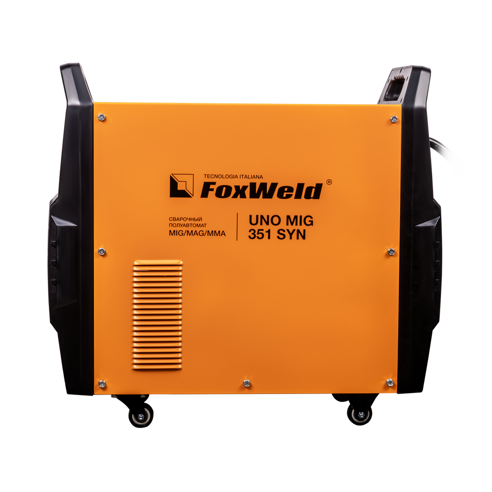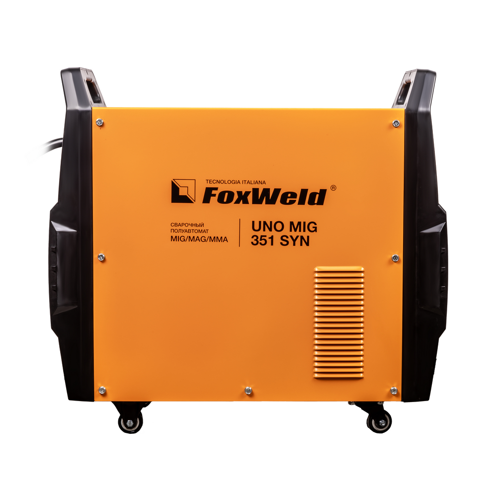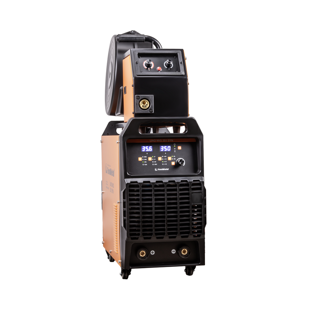 UNO MIG 351 SYN – промышленный/профессиональный трёхфазный инверторный сварочный полуавтомат. Аппарат имеет защиту от перегрузки, индикатор перегрева и неисправности, отличается высокой стабильностью сварки в реальном времени, простым интуитивно понятным управлением сварочными параметрами. UNO MIG 351 SYN с синергетическим управлением предназначен для широкого использования в отраслях по производству металлоконструкций, в сервисных металлоцентрах, при ремонте и восстановлении. Сварочный источник позволяет производить сварку изделий из низкоуглеродистой и легированной стали и алюминия. Максимально надёжная сварочная установка с отдельным 4-роликовым полноприводным механизмом подачи проволоки, двумя мощными ручками на корпусе и колёсами для перемещения идеально подойдёт для рабочего места сварщика. В механизм подачи сварочной проволоки можно установить катушки диаметром D200, D300.ВЫСОКАЯ ПРОИЗВОДИТЕЛЬНОСТЬ: Параметр ПВ (продолжительность включения) 80% на максимальном токе при КПД 85% и 4-роликовый полноприводный механизм подачи сварочной проволоки обеспечивают бесперебойную устойчивую работу сварочного аппарата в течении всего рабочего дня. Это позволяет производить безостановочный сварочный процесс и выполнять работы, которые требуют больших временных затрат, что повышает скорость и производительность.4-РОЛИКОВЫЙ МЕХАНИЗМ ПОДАЧИ: 4-роликовый полноприводный механизм подачи обеспечивает стабильную подачу сварочной проволоки в область сварки без рывков и проскальзываний при использовании горелок с длинным шлангом и при продолжительном сварочном процессе. 4 ведущих ролика механизма подачи способствуют минимальному давлению и деформации на сварочную проволоку, что критически важно для качественной и стабильной сварки алюминия и сплавов.СИНЕРГЕТИЧЕСКИЙ РЕЖИМ УПРАВЛЕНИЯ: Режим синергетики позволяет сэкономить время и получить качественное сварное соединение даже новичку, так как основные параметры подбираются автоматически с возможностью тонкой ручной подстройки сварочного процесса. Синергетику можно отключить для работы в ручном режиме.ФУНКЦИЯ VRD: Функция VRD (снижение напряжения холостого хода) повышает безопасность и исключает риск поражения сварщика электрическим током. Сварочный процесс становится более безопасным в замкнутых пространствах и при сварке в условиях повышенной влажности.УВЕЛИЧЕННЫЙ СРОК СЛУЖБЫ: Сварочный аппарат исполнен в качественном и надёжным корпусе и рассчитан на интенсивную ежедневную эксплуатацию на максимальном токе. Источник питания относится к классу профессионального и надёжного оборудования. Высокая культура производства завода изготовителя, надёжные и мощные компоненты аппарата, грамотная и продуманная система отвода тепла, проверенная временем и надёжная схемотехника инвертора на IGBT транзисторах гарантируют жизненный цикл аппарата не менее 10 лет.ПРЕИМУЩЕСТВА:Синергетический режим управления при полуавтоматической сваркеПолуавтоматическая сварка самозащитной проволокой без газаПолноприводный 4-роликовый механизм подачи проволокиРежимы работы горелки 2T, 4T, SP4T, SPOTФункция VRD (снижение напряжения холостого хода)Максимальный ток 350 A в режимах MMA и MIG/MAGЭргономичное исполнение на базе IGBTФункции продувки газом, Burn Back, Soft Start в режиме MIG/MAGРегулируемые функции Arc Force и Ho
