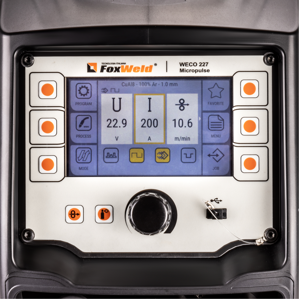 Сварочный полуавтомат WECO MIG 227 DP DIGITAL разработан для обеспечения сварщиков легким и мобильным сварочным аппаратом, который благодаря уменьшенному объёму можно легко перемещать в любом месте, в том числе при проведении сварки в труднодоступных местах. Перемещение аппарата облегчается благодаря эргономичной верхней ручке. 2-роликовый механизм подачи с оптическим датчиком обеспечивает эффективную и точную подачу проволоки. Наличие мощного микропроцессора позволяет полностью управлять всеми функциями сварки, делая систему пригодной для различных видов сварочного процесса. С помощью USB-разъёма можно обновить программное обеспечение аппарата, записать на USB-накопитель сохранённые режимы сварки и перенести их с одного аппарата на другой.Аппараты FoxWeld серии WECO собрали в себе опыт разработки и эксплуатации профессионального сварочного оборудования, начиная с 1998 г. Все аппараты линейки WECO разрабатываются и производятся в Италии на заводе Corso Noblesville. Высокое качество производства и надежность наших аппаратов позволяют обеспечивать расширенную гарантию на всю линейку FoxWeld серии WECO.ФУНКЦИЯ POWER FOCUS: Концентрация дуги POWER FOCUS позволяет сварщику сфокусировать высокую температуру дуги в центральной части сварочной ванны, избегая таким образом перегрева кромок. Это новая технология сварки деталей из углеродистой стали используется, когда требуется глубокий провар в сочетании с высокой производительностью. Сфокусированная дуга позволяет делать меньшее число проходов для заполнения стыковых швов.ФУНКЦИЯ POWER ROOT: Функция вместе с синергетическими программами оптимизирует холодно-капельный перенос металла для получения высокого качества сварки корневого шва углеродистых и нержавеющих сталей, в том числе аустенитных. Технология обеспечивает улучшенную форму шва при сварке тонких деталей и при выполнении вертикальных швов с большим зазором.WECO DIGITAL CONTROL TECHNOLOGY: Мгновенная стабильность и оптимальный баланс дуги от зажигания до завершения сварочного процесса. Цифровое управление инвертором позволяет быстро и точно регулировать характеристики процесса. Сварочные параметры динамически контролируются и изменяются в режиме реального времени.WECO PFC: Цифровой импульсный режим сварки значительно снижает общие затраты на потребляемую электроэнергию благодаря корректору коэффициента мощности (PFC). Экономия электроэнергии по сравнению с традиционным инвертором составляет 30 %, а по сравнению с электромеханическим сварочным аппаратом – 45 %.РЕЖИМ GENERATOR: Специальный режим для работы от генератора позволяет оптимизировать потребляемую мощность от номинальной мощности используемого генератора, защищая сварочный аппарат и используя всю доступную мощность.ПРЕИМУЩЕСТВА:Двойной импульс, обеспечивающий качественную и надёжную сварку алюминия и нержавеющей сталиСинергетический режим управленияВозможность загрузки/сохранения/передачи 99 программ сварки2-роликовый механизм подачи проволоки с цифровым интерфейсом и возможностью бесперебойной работы до 50 мЗащитный экран передней панели управленияСветодиодная подсветка в отсеке подачи проволокиРежимы работы горелки 2T, 4T, SP2T, SP4T, SPOTМаксимальный ток 220 A в режимах MIG/MAG, TIG LIFTРегулируемые функции Arc Force и Hot Start в режиме MMAФУНКЦИОНАЛЬНЫЕ ОСОБЕННОСТИ:QUICK SETTING: Интуитивно понятный и удобный инт