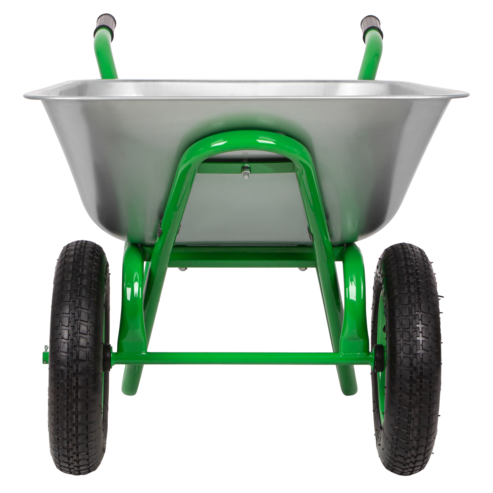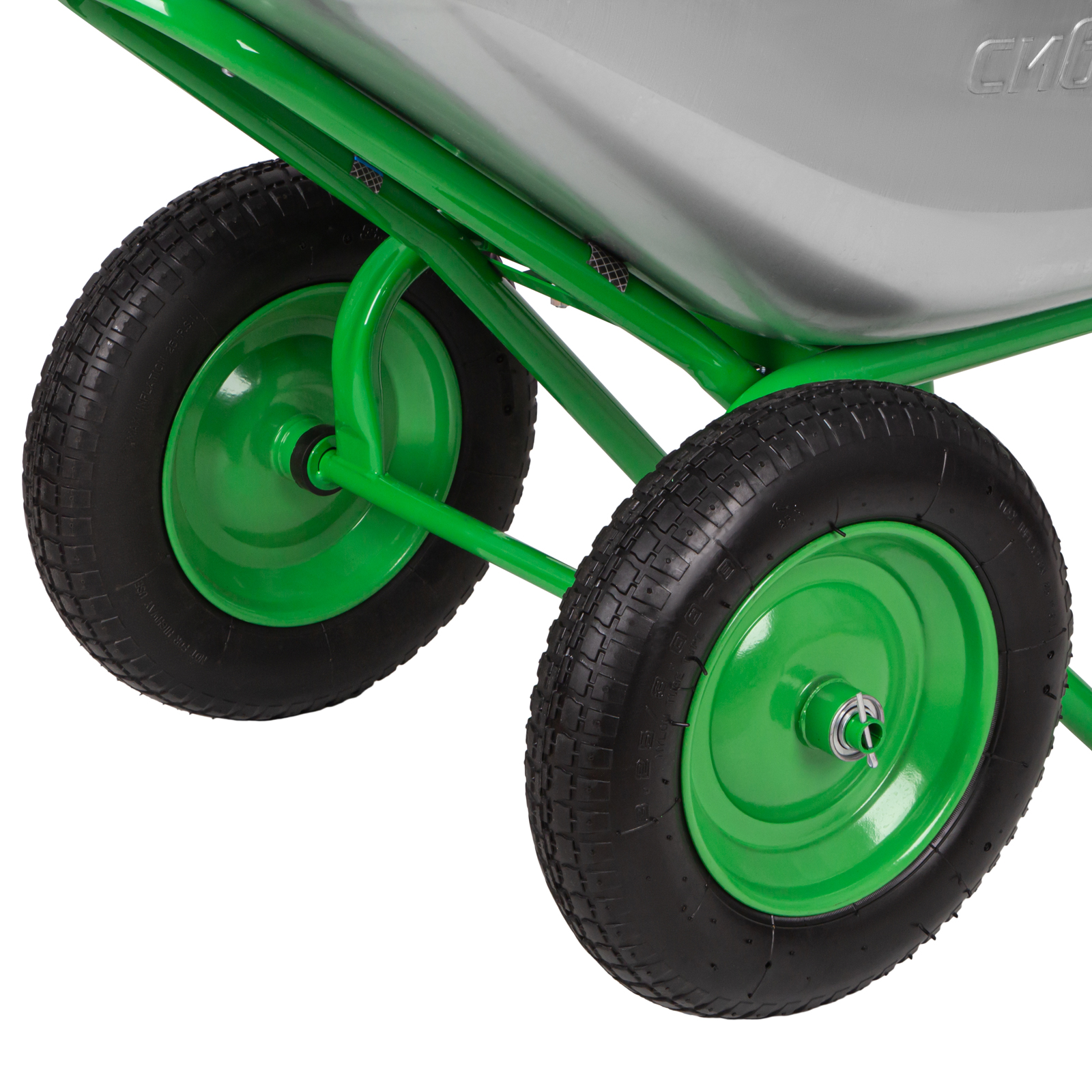 - Удобное перемещение даже по неровной поверхности — пневмоколеса с камерами и резиновыми шинами повышают плавность хода, каждое имеет по 2 шариковых подшипника, облегчающих вращение и препятствующих износу.