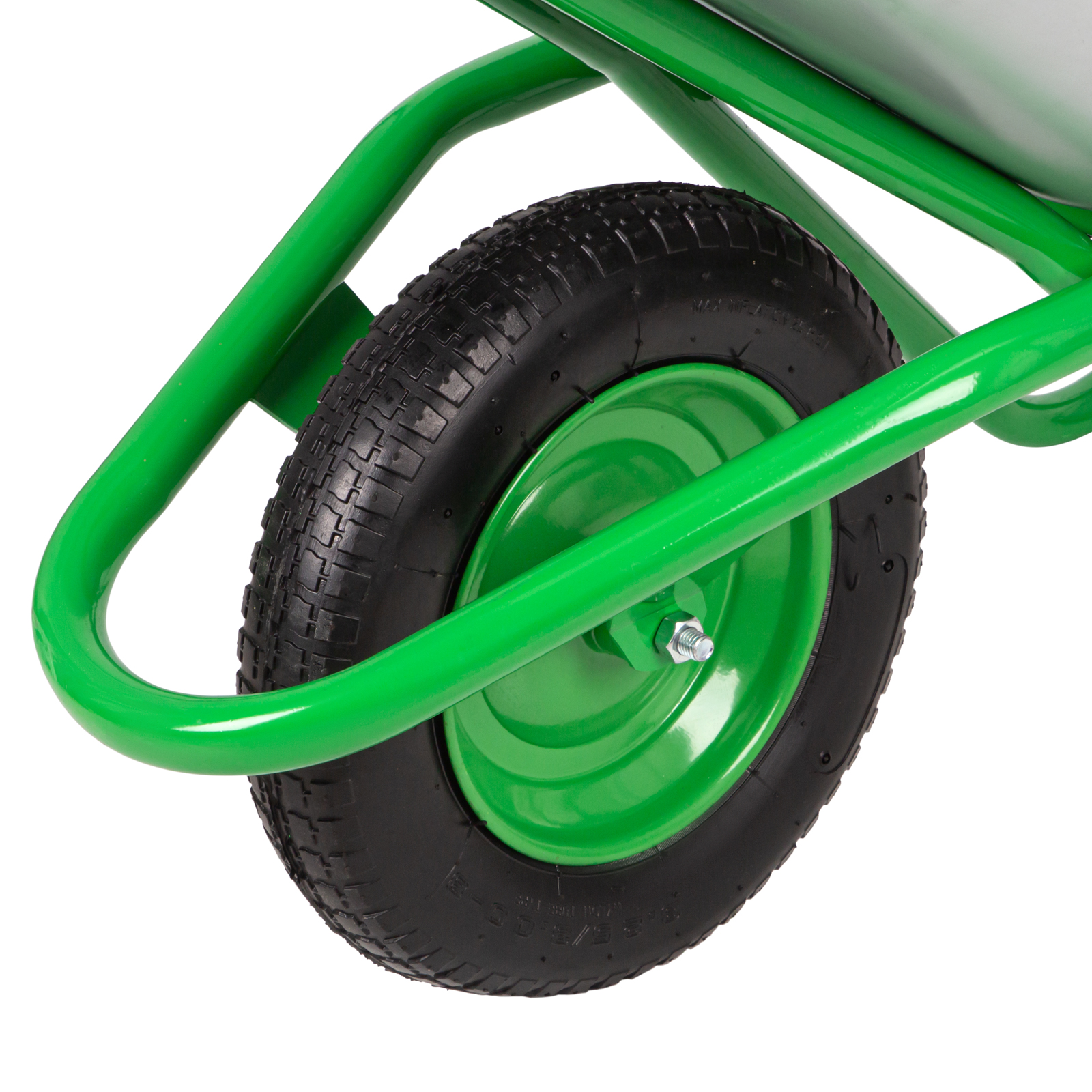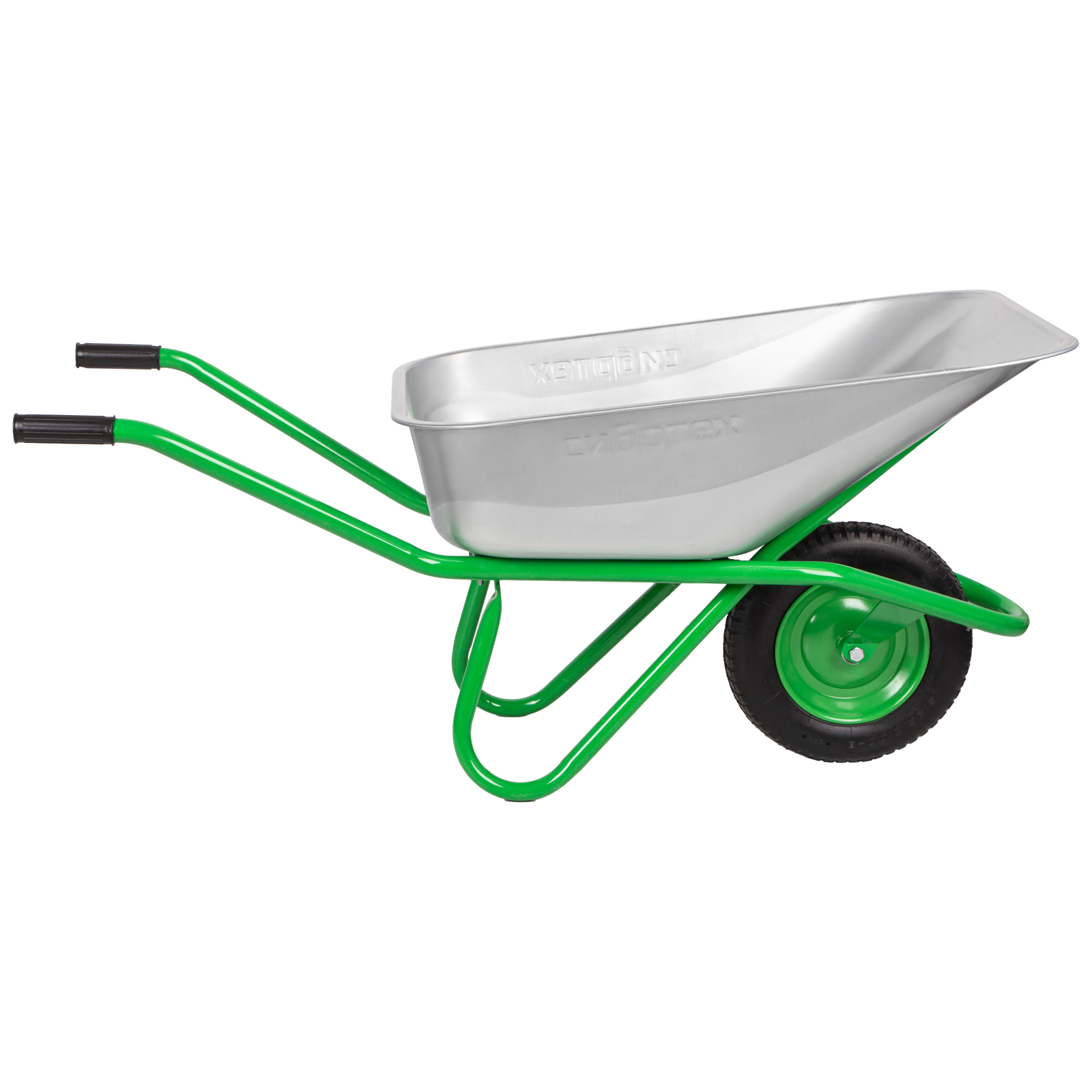 - Высокая грузоподъемность — переднюю часть кузова поддерживает дополнительная опора, поэтому тачка выдерживает вес до 170 кг.