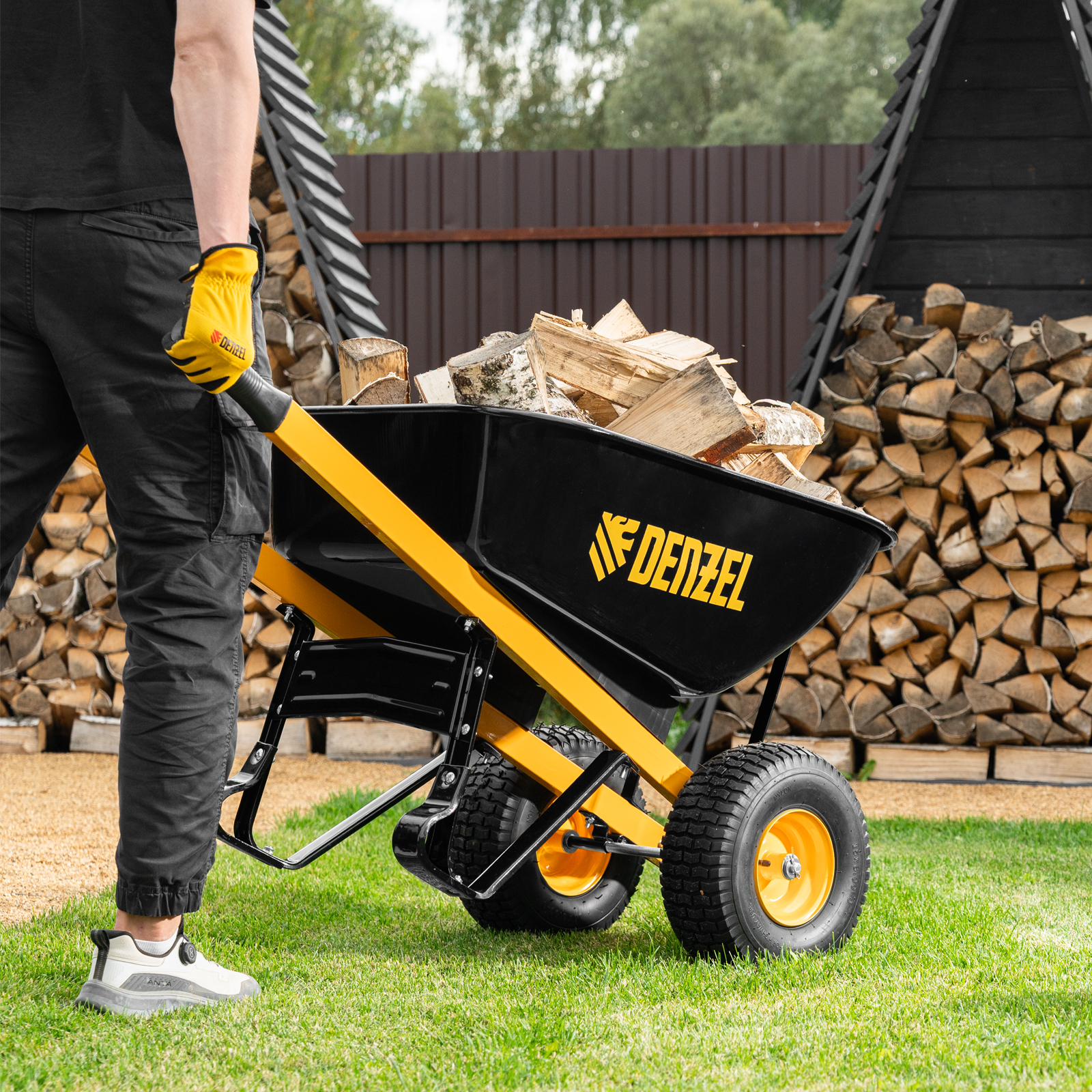 - Устойчивость — широкие пневматические колеса с грунтозацепом и мощная рама с подпятниками предотвращают проваливание тачки в грунт.