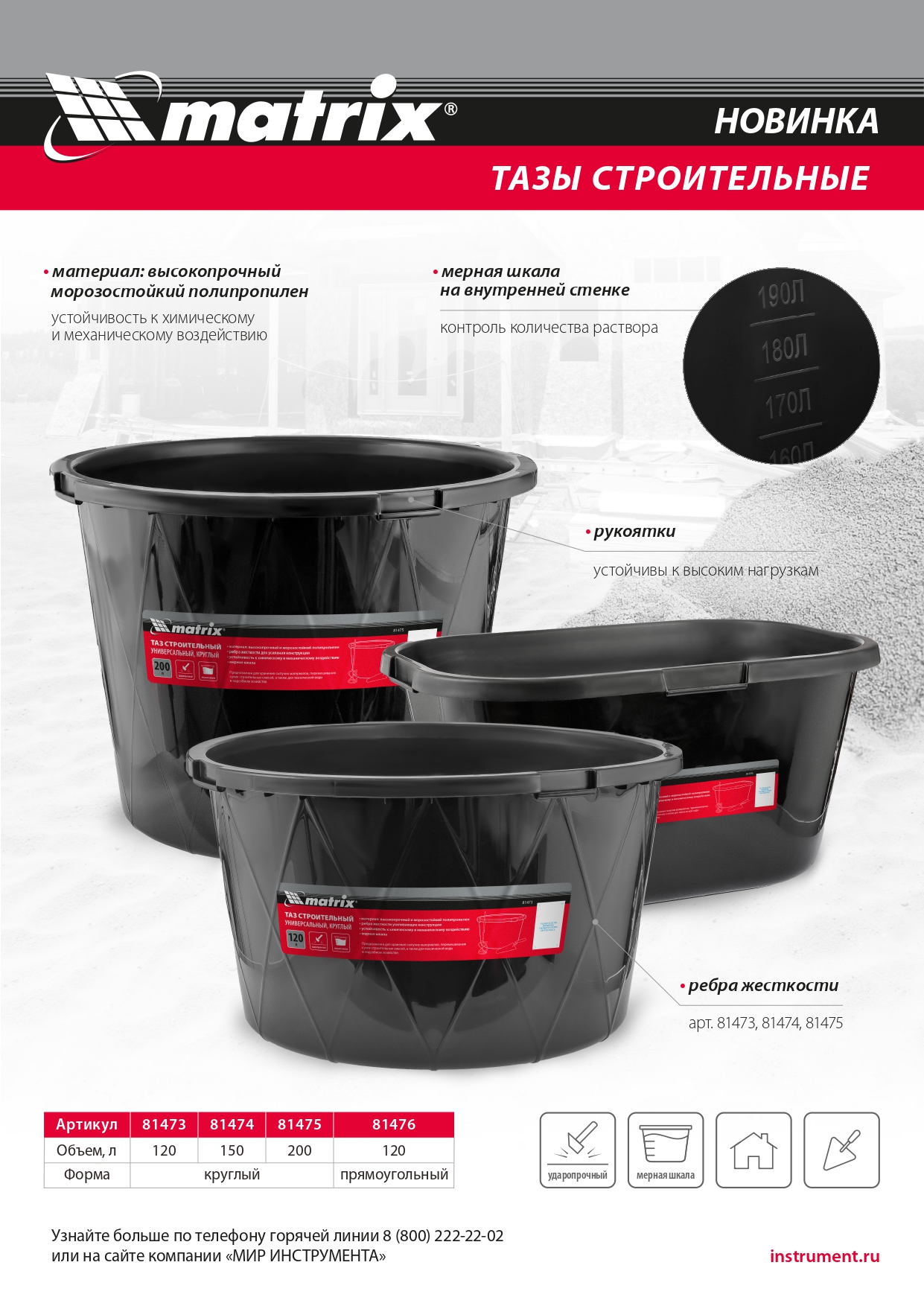 Круглый строительный ударопрочный таз Matrix 81474 с ребрами жесткости, объемом 150 л, универсален в применении: он используется для перемешивания строительных смесей, хранения сыпучих материалов и воды для технических нужд. Будет полезен во время проведения строительно-отделочных работ, пригодится также в подсобном хозяйстве и на огороде.
