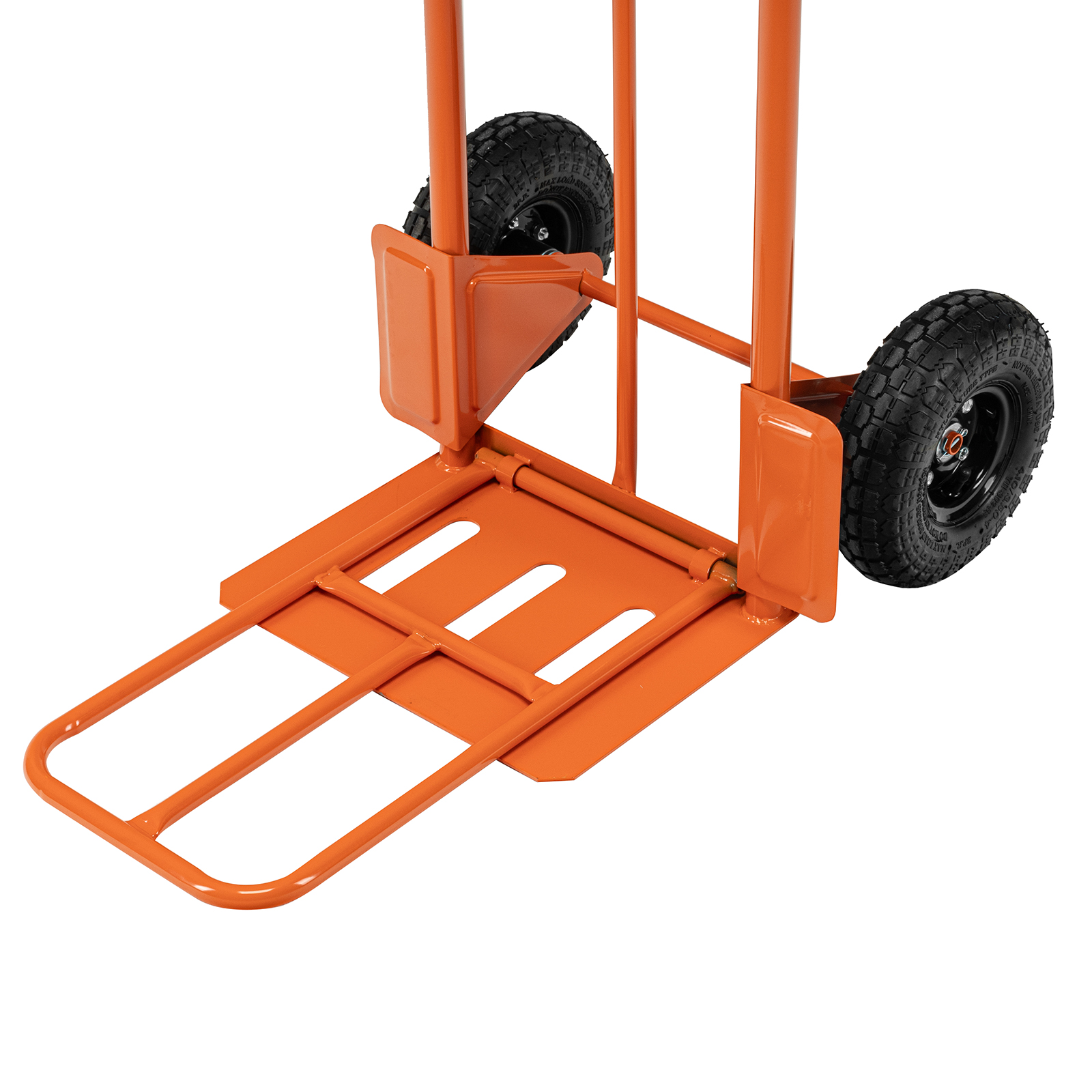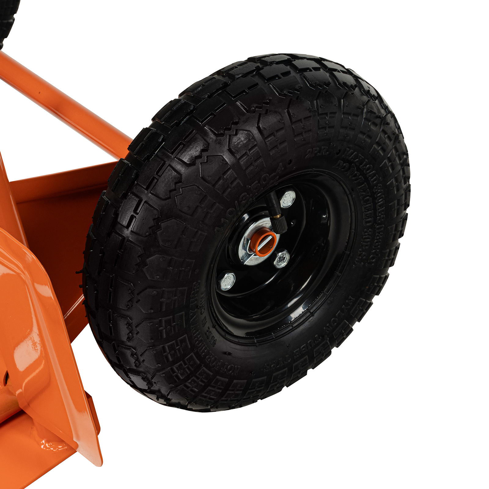 - Удобная транспортировка груза — пневматические колеса с камерами, резиновыми шинами и 2 шарикоподшипниками в каждом гасят вибрации и обеспечивают плавность хода.