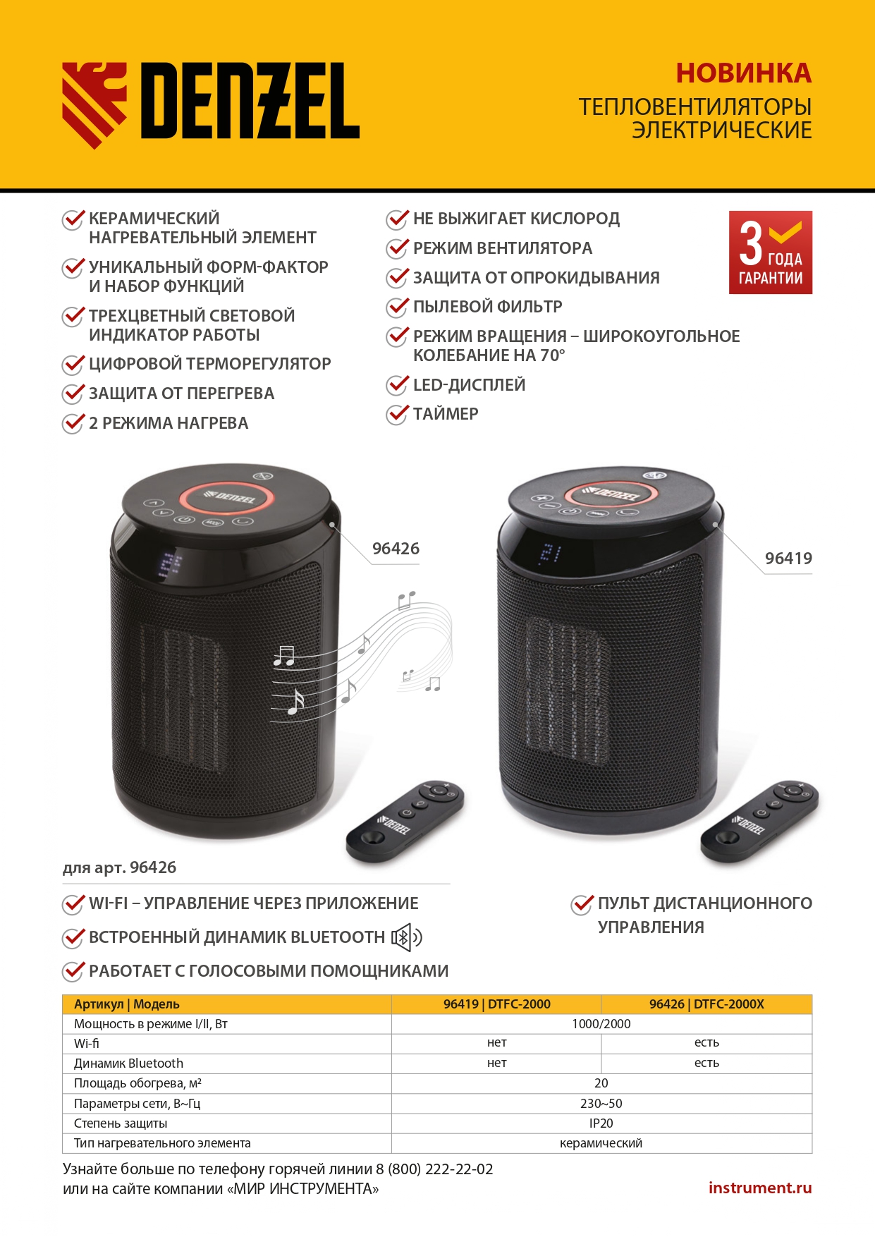 Тепловентилятор электрический керамический DTFC-2000, пульт, 3 режима, вентилятор, нагрев 1000/2000 Вт Denzel