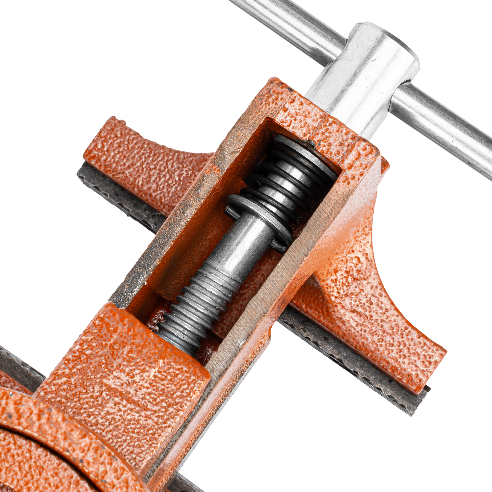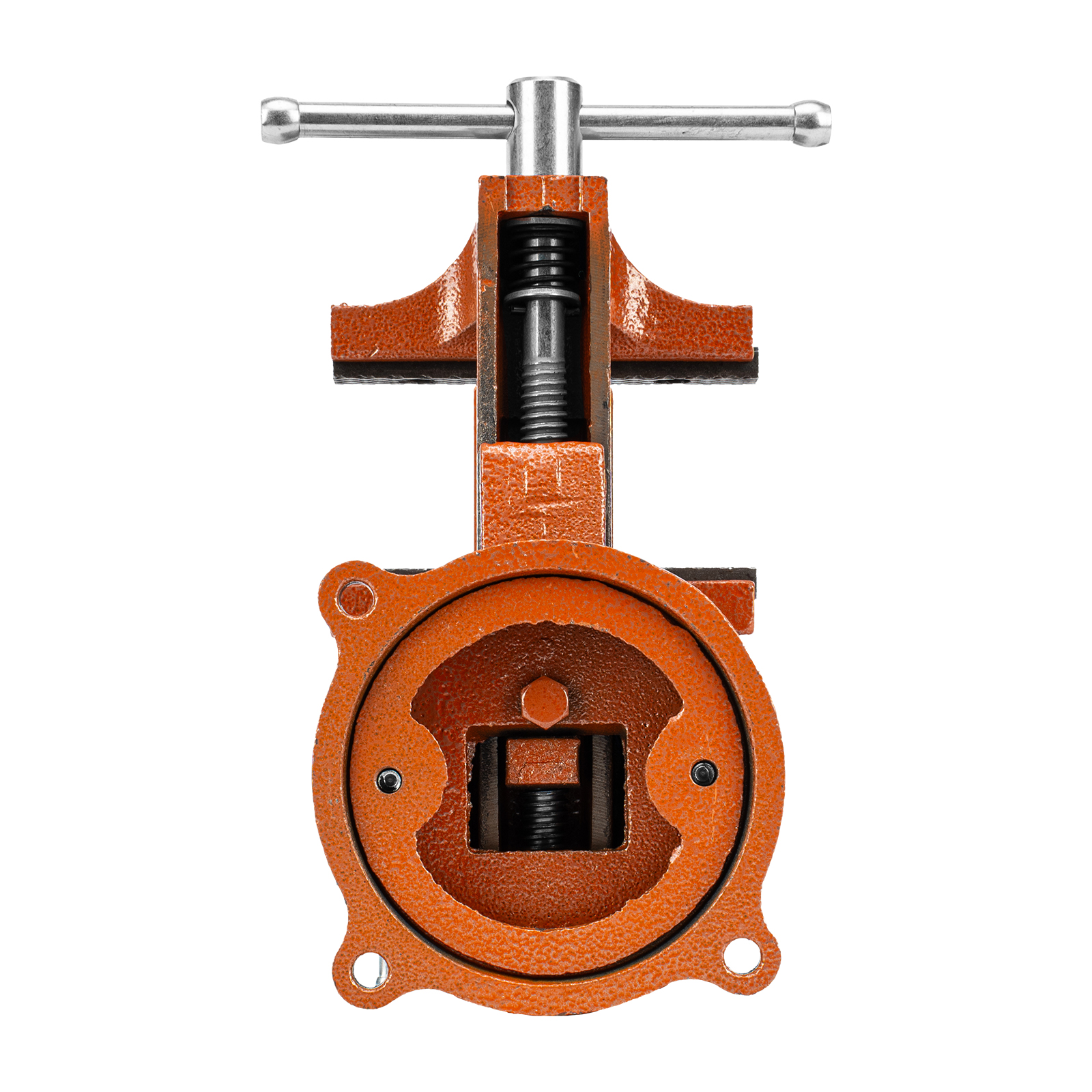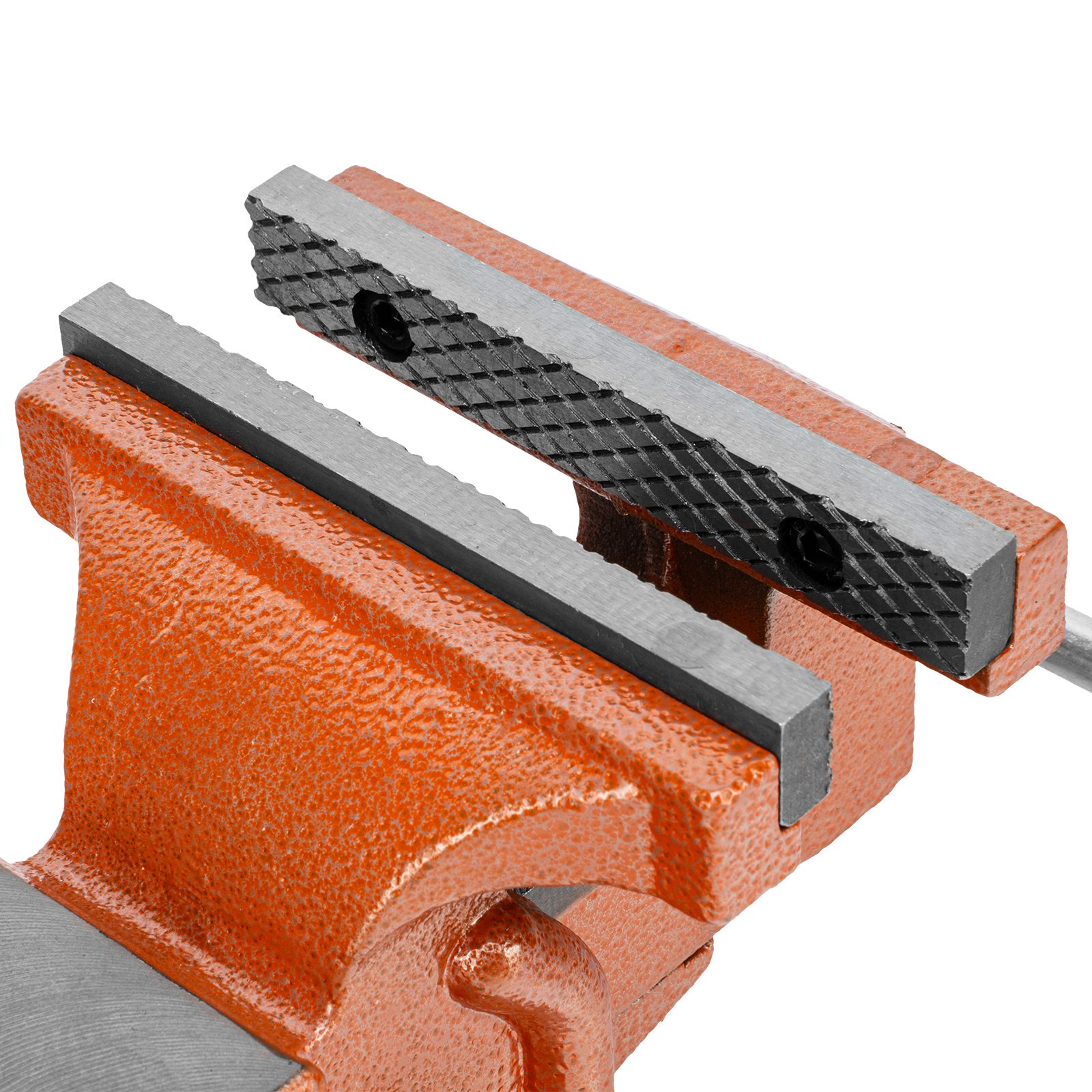 - Корпус тисков выполнен из чугуна, а губки — из стали, благодаря чему достигается высокая прочность инструмента.