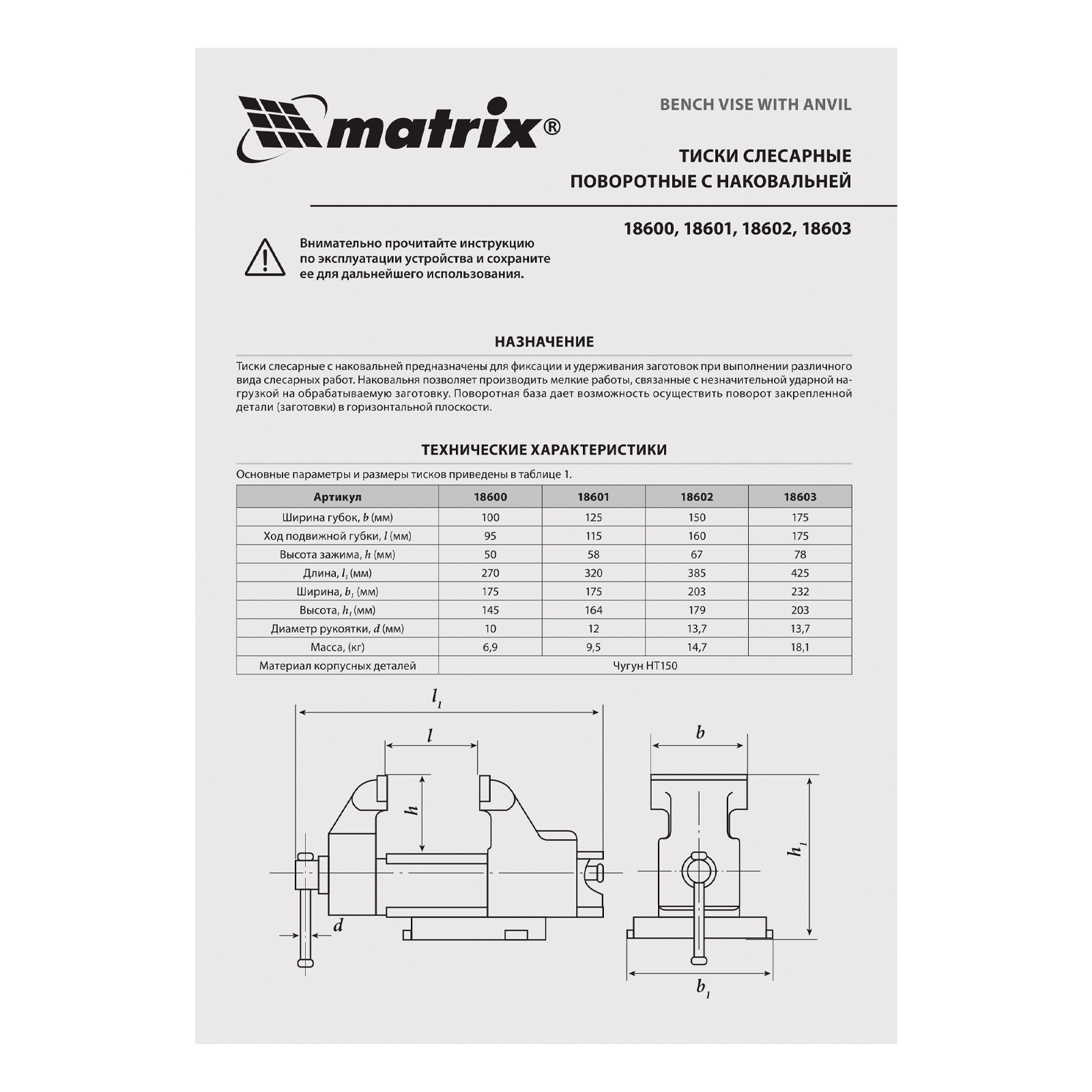Поворотные слесарные тиски Matrix 18603 с наковальней и губками шириной 200 мм имеют рабочий ход 175 мм и предназначены для захвата и фиксации различных деталей. Поворотный механизм с прижимными винтами позволяет вращать тиски на 360° и фиксировать их в выбранном положении для удобной обработки заготовок с разных сторон. Инструмент используется для шлифовки, сверления и проведения других работ. Будет полезен в мастерской и гараже.