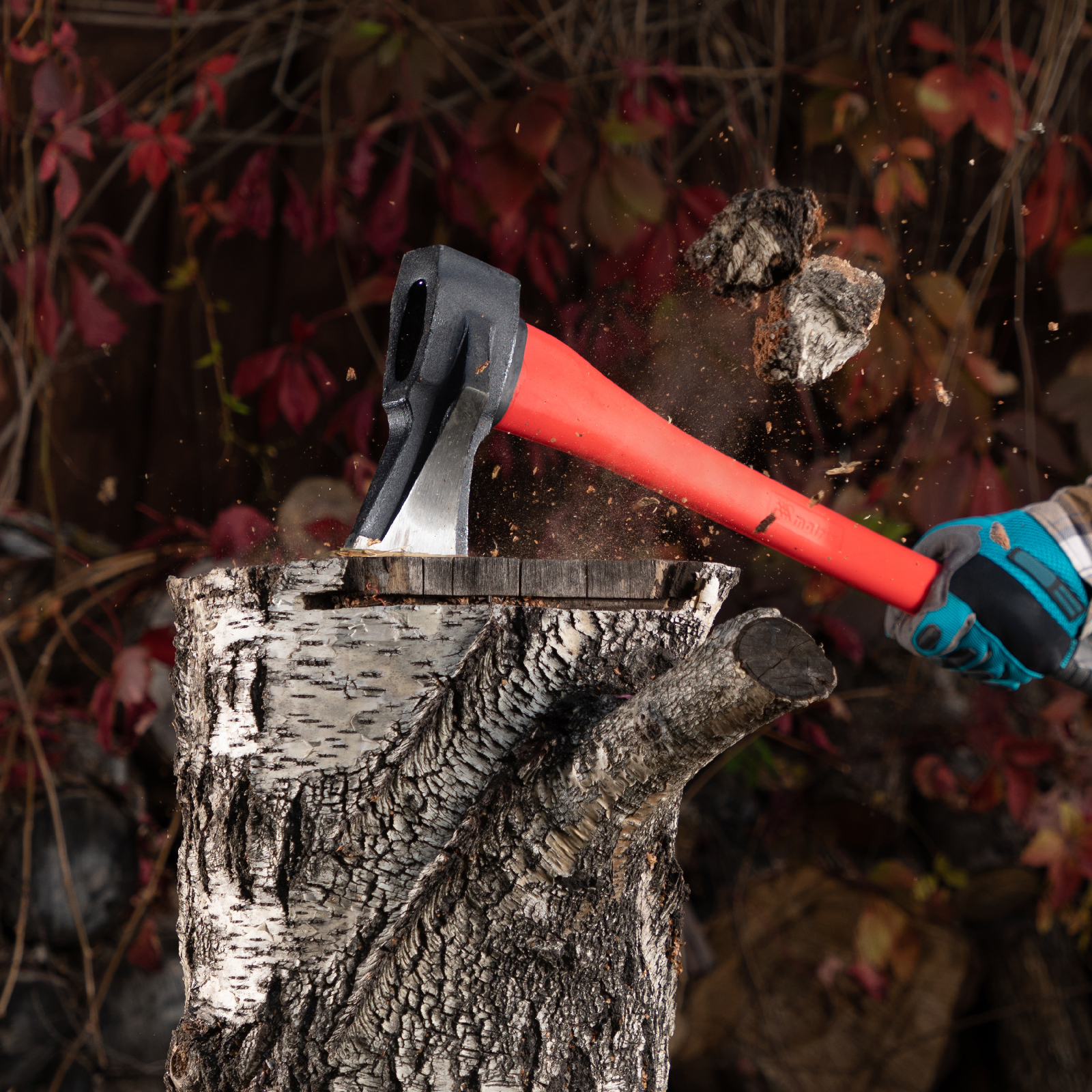 - Фибергласовое топорище — инструмент устойчив к механическим повреждениям и воздействиям агрессивной среды, а также гасит колебания от ударов.