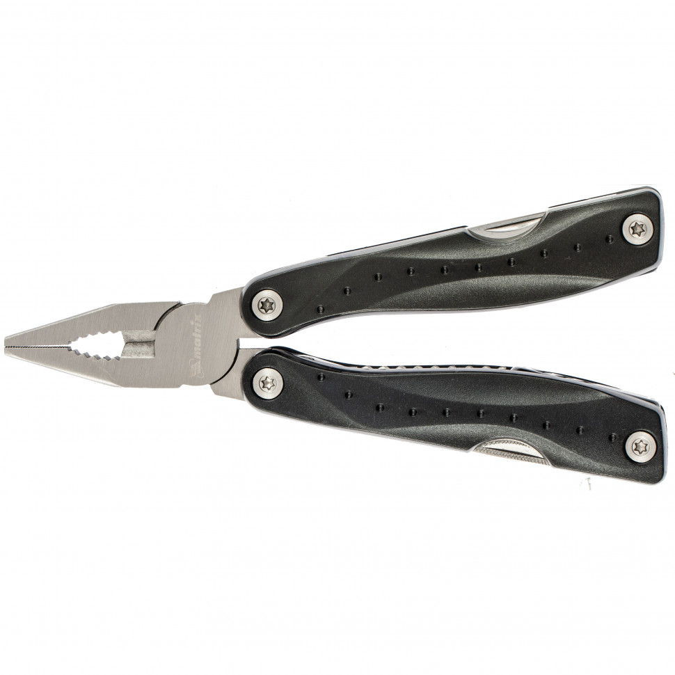 Трансформер Matrix 17621 длиной 160 мм имеет 13 функций и авторазжим, поставляется с чехлом. Его можно использовать в гараже — мультитул включает в себя длинногубцы с кусачками и захватом полукруглых предметов, а также отвертки. Инструмент пригодится в походе, на рыбалке или охоте, поскольку имеет в составе нож, пилу, открывалку и консервный нож. Благодаря пилке для ногтей трансформер будет полезен и в быту.