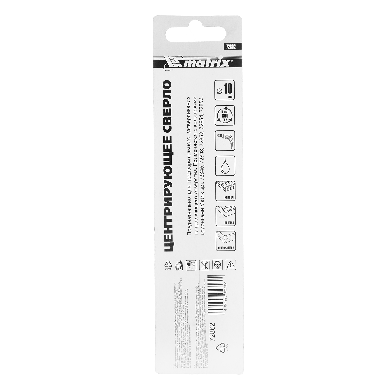 Центрирующее сверло для коронок Matrix 72862 диаметром 10 мм, с карбидным напылением и 6-гранным хвостовиком, устанавливается в державку Matrix 72860. Облегчает засверливание и повышает точность работы, предотвращая смещение державки и коронки. Также с его помощью державка с коронкой фиксируется в патроне дрели и шуруповерта. Сверло рассчитано на работу с водяным охлаждением, что значительно повышает срок его службы.