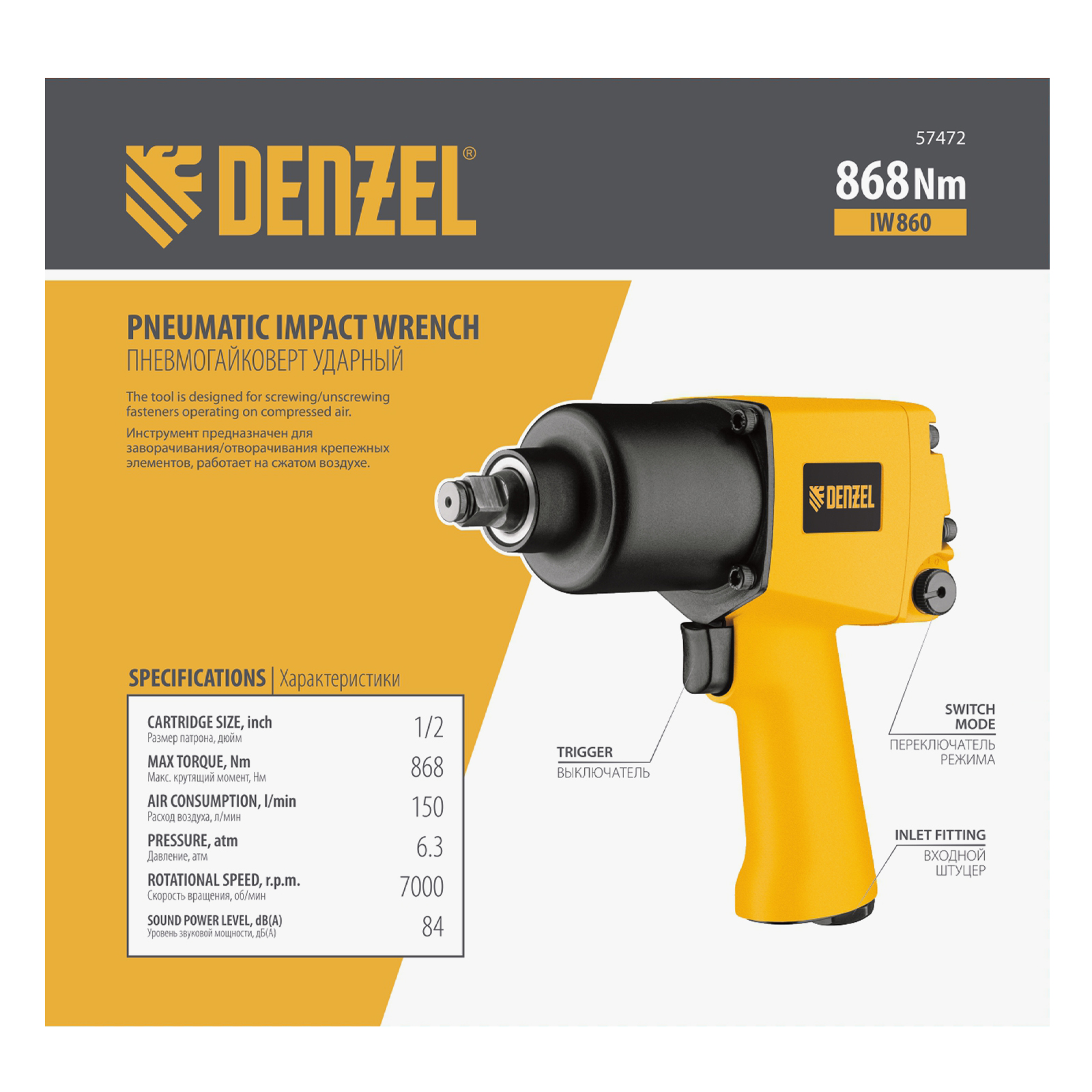Ударный пневмогайковерт IW860, 1/2", 7000 об/мин, 868 Нм Denzel в Екатеринбурге