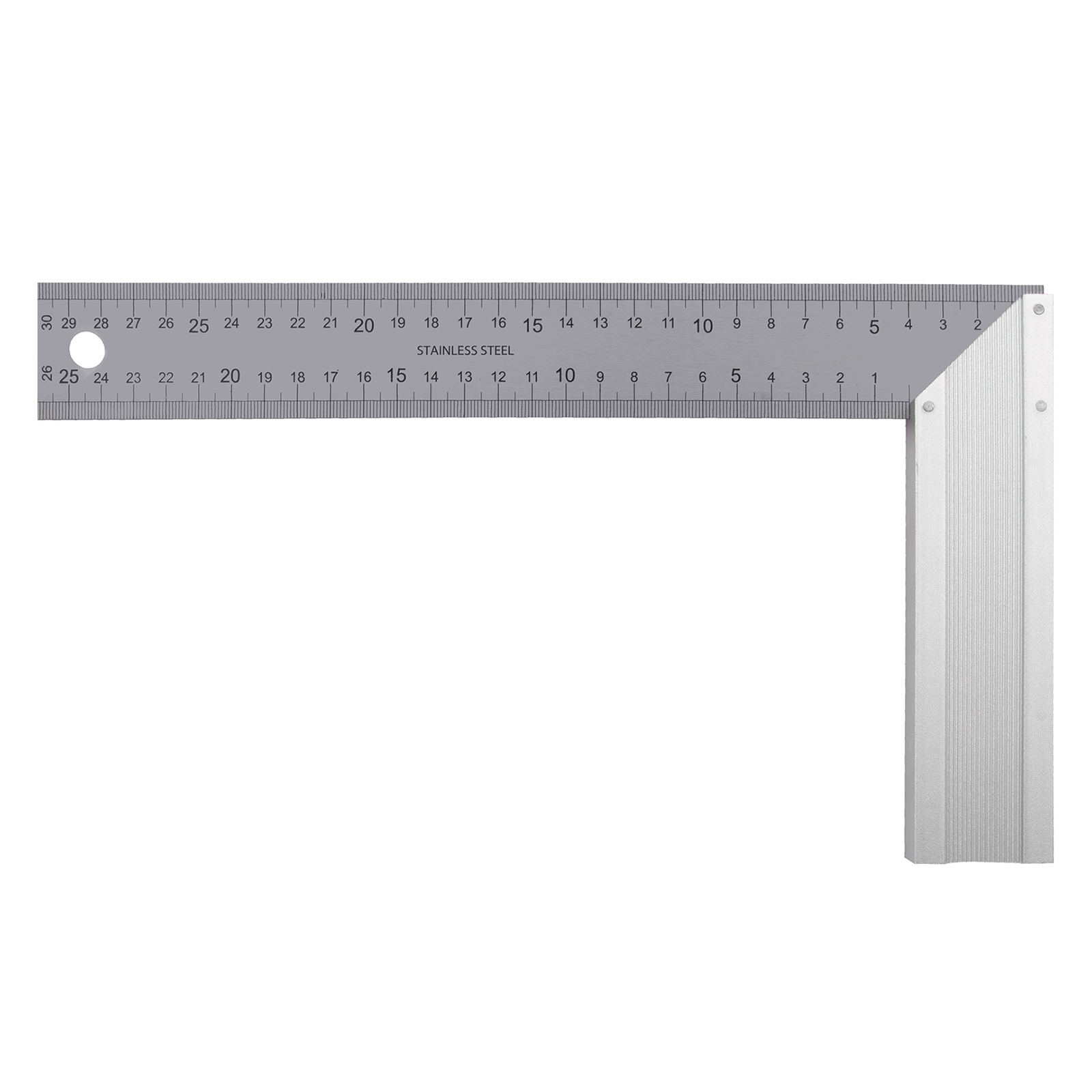 Стальной угольник Denzel 32397 длиной 300 мм, с градуировкой, алюминиевым основанием и полотном из нержавеющей стали, используется для построения и контроля углов. Будет полезен для выполнения столярных и строительных работ.