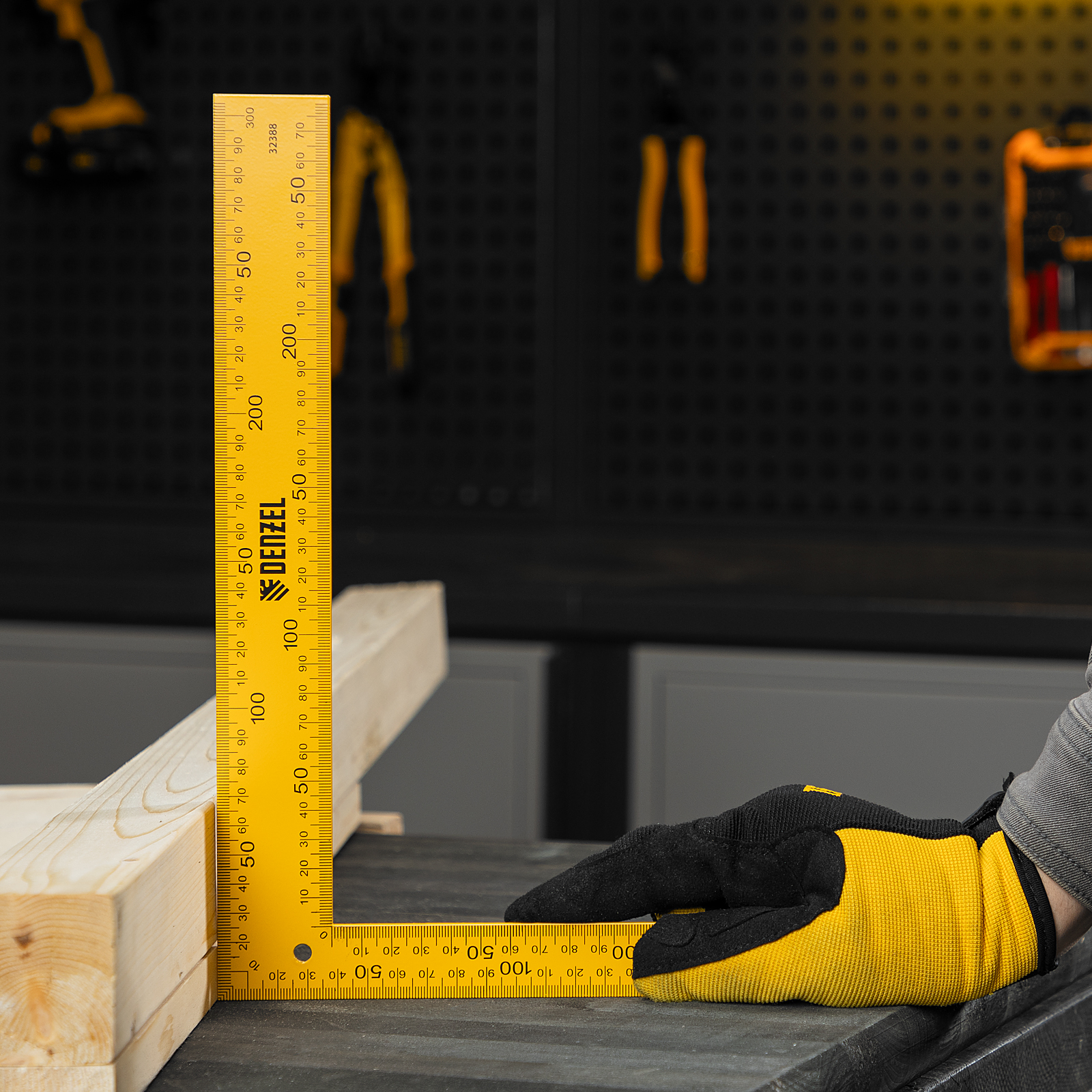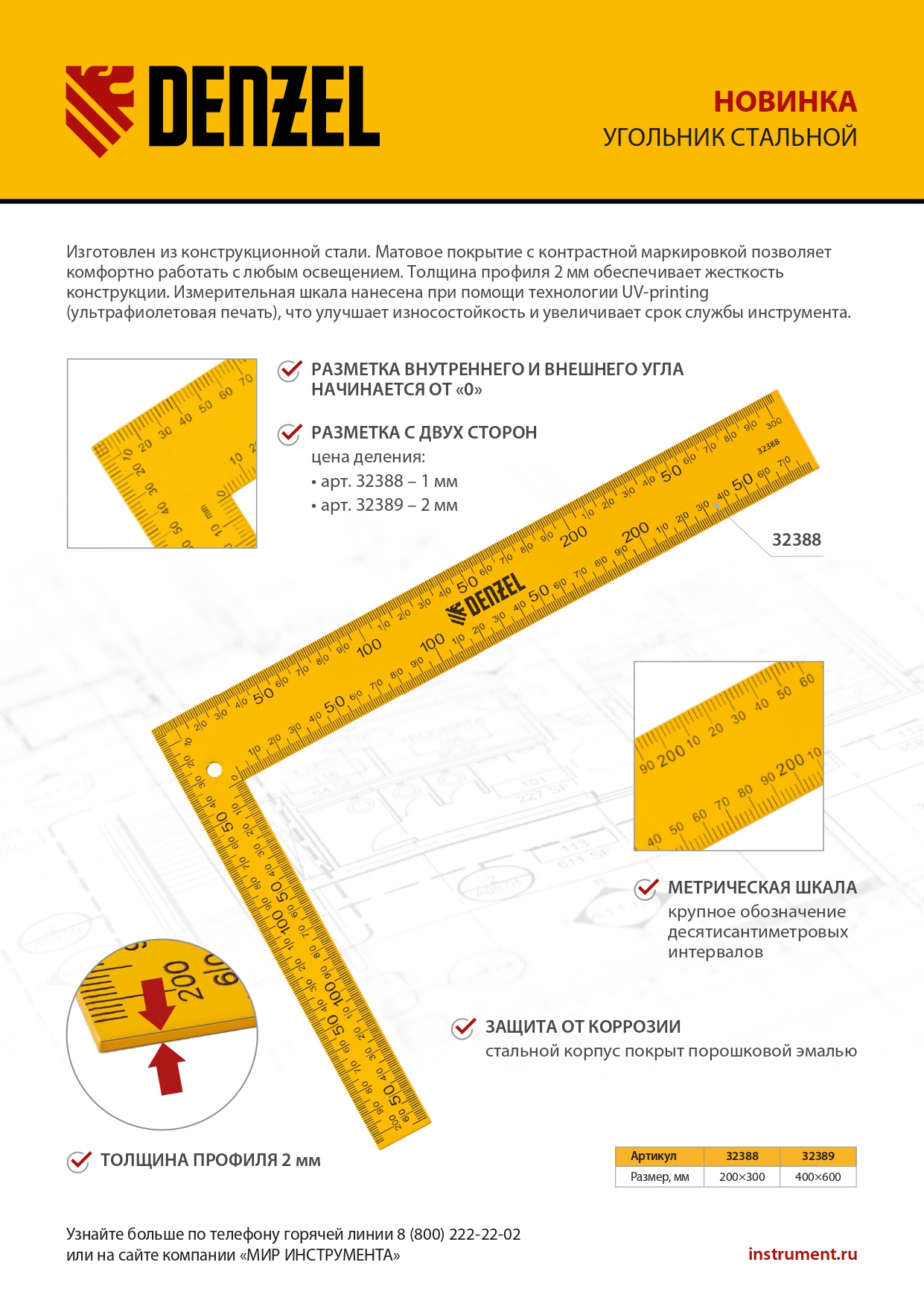 Стальной угольник Denzel 32388 размером 200 х 300 мм используется для разметки поверхностей и проверки прямых углов. Четкая двусторонняя измерительная шкала упрощает работу. Инструмент пригодится для выполнения столярных работ.