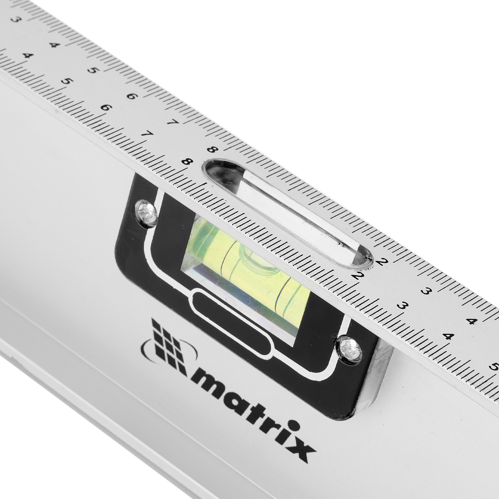 Алюминиевый уровень Matrix «Рельс» 34029 длиной 1000 мм имеет 3 глазка: 2 для проверки отклонений от заданной вертикали и горизонтали и 1 поворотный для проверки наклонных поверхностей.