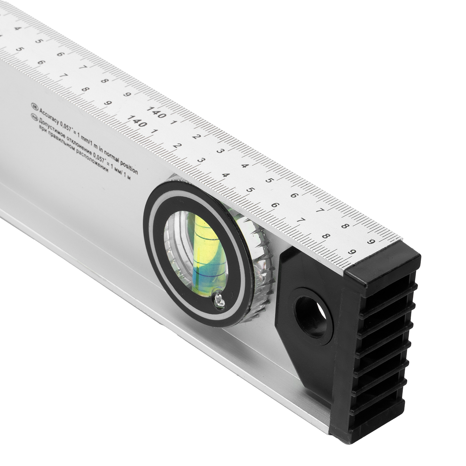 Алюминиевый уровень Matrix «Рельс» 34035 длиной 1500 мм имеет 3 глазка: 2 для проверки отклонений от заданной вертикали и горизонтали и 1 поворотный для проверки наклонных поверхностей.