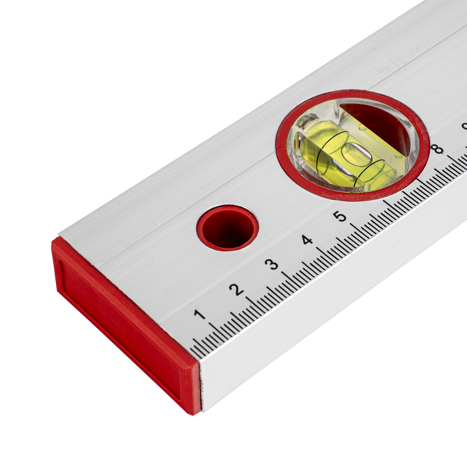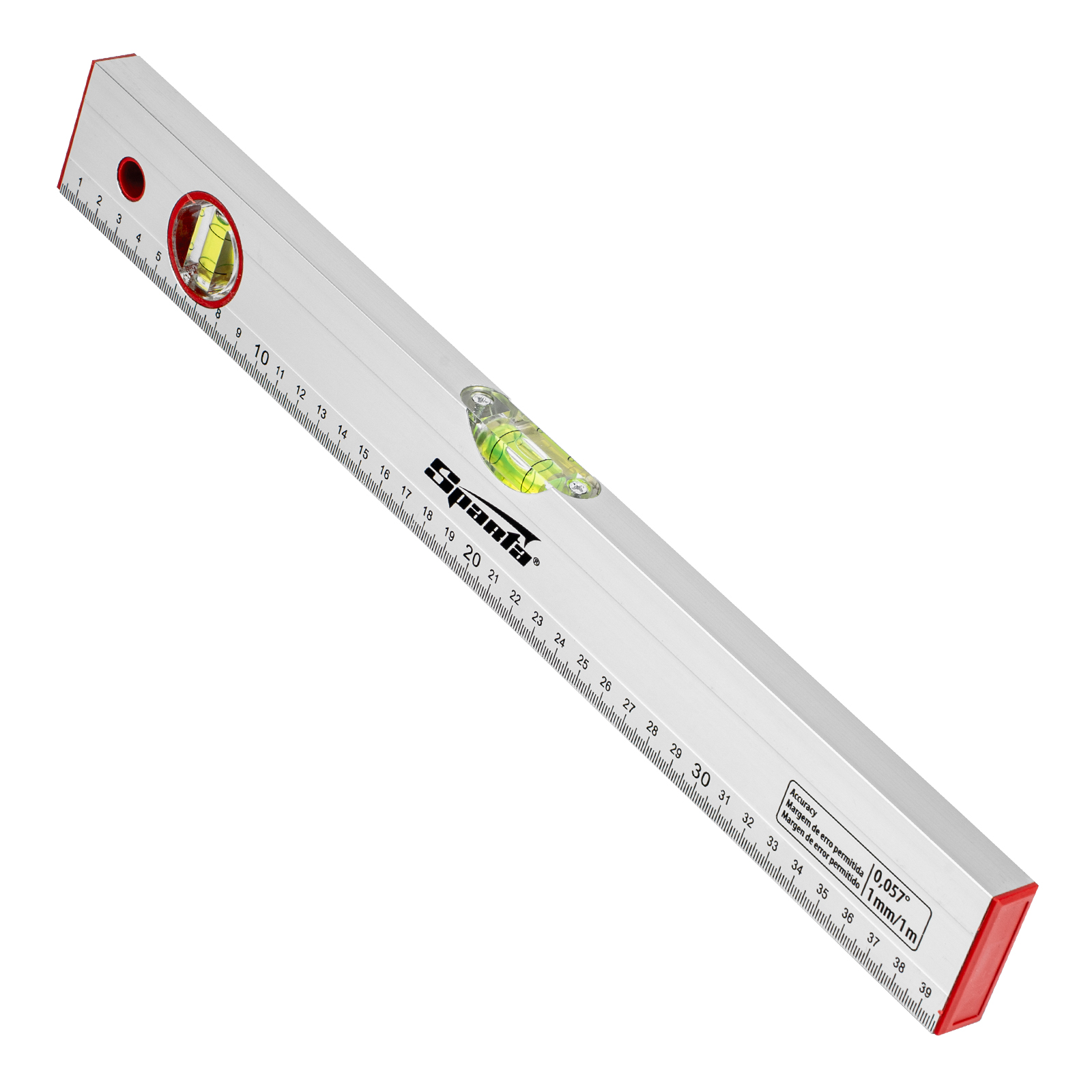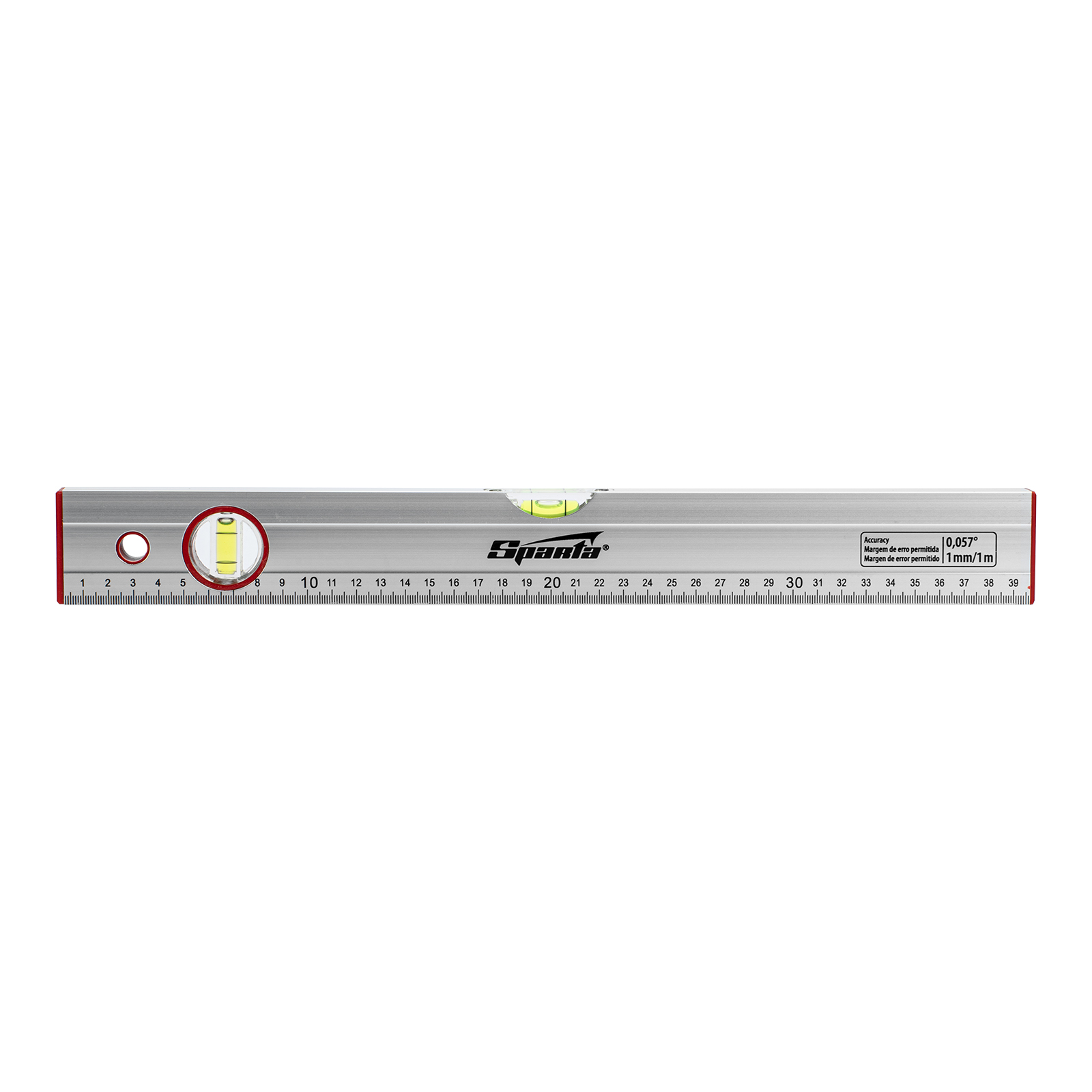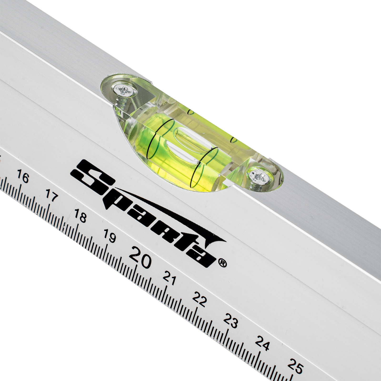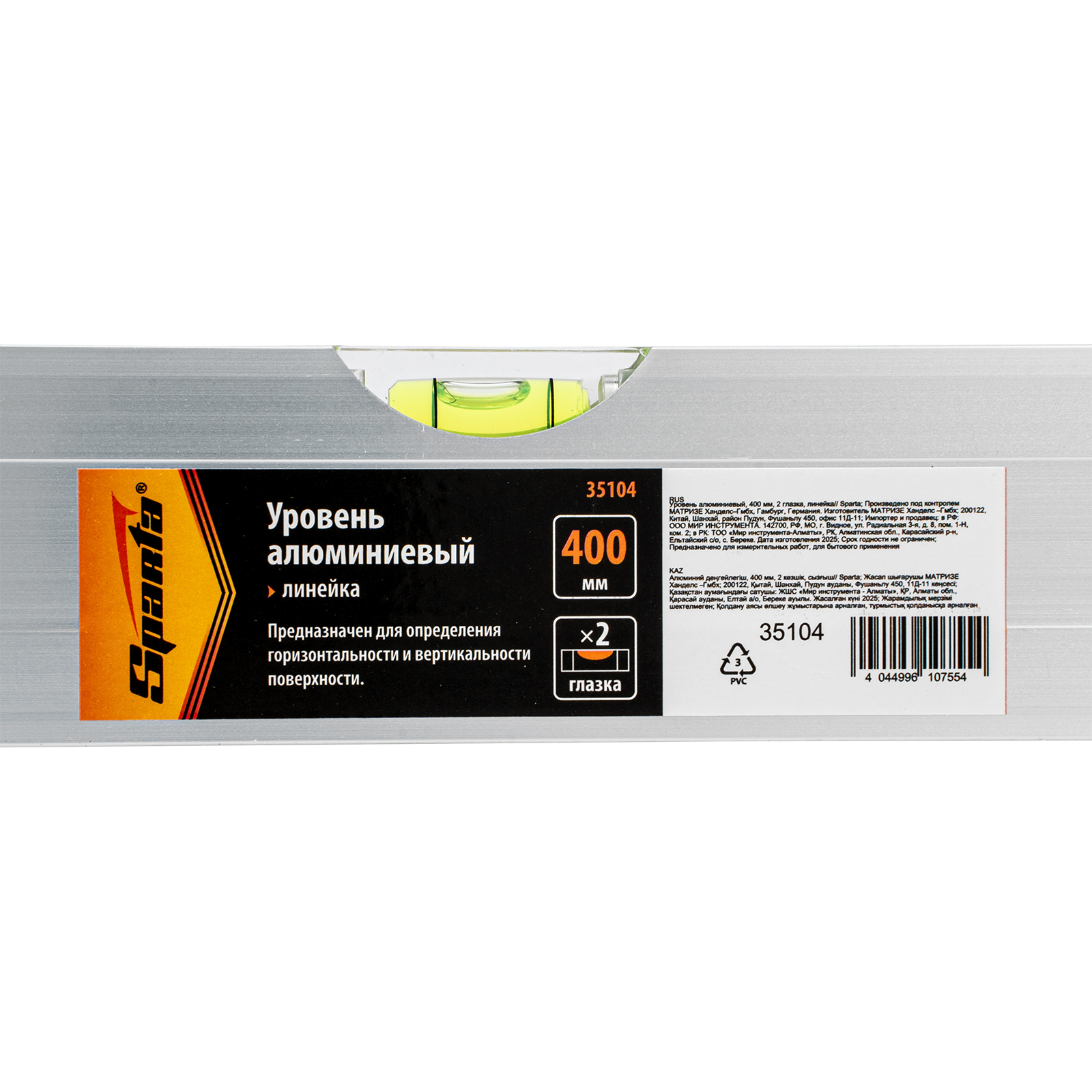 Алюминиевый уровень Sparta 35104 длиной 400 мм, с 2 глазками и линейкой, рассчитан на применение в быту и в производственных условиях. Он поможет добиться точного выстраивания разметочных линий для последующей установки конструкций, полок, укладки облицовочных материалов и т.д. Две пузырьковые ампулы обеспечивают точный контроль отклонений поверхностей от горизонтальной и вертикальной плоскостей.,Для определения отклонения вертикали 90 градусов необходимо использовать пузырьковую ампулу только в верхнем положении уровня. Только базовая поверхность является рабочей (противоположная ампуле 180 градусов).