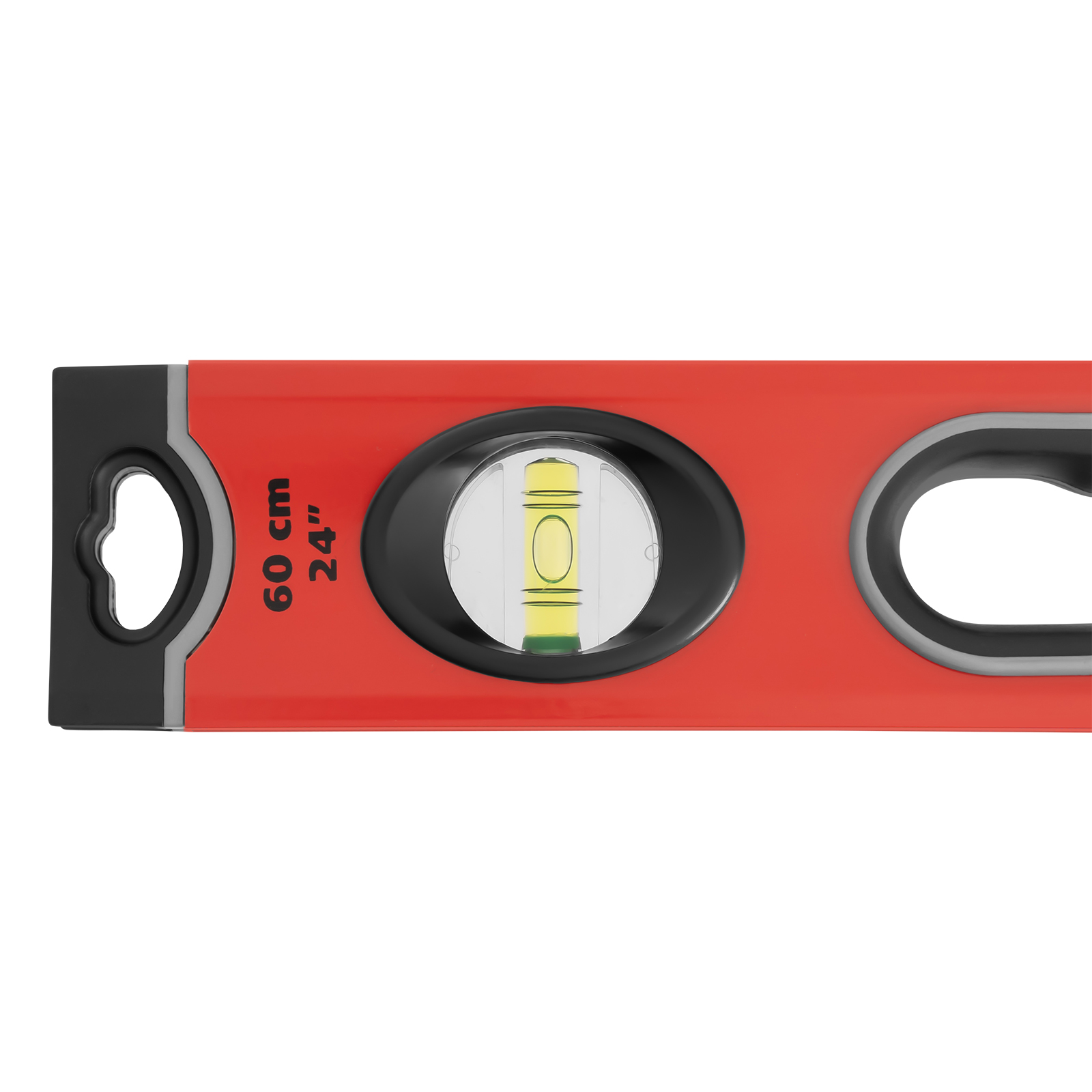 Алюминиевый уровень Matrix 34304 длиной 600 мм, с 3 глазками, ударопрочными заглушками и двухкомпонентными ручками, повышает точность работы, т. к. позволяет обнаружить отклонения от вертикали, горизонтали и угла 45°. Используется для монтажа конструкций, укладки покрытий, облицовки поверхностей и т. д., подходит для профессионального и бытового применения.