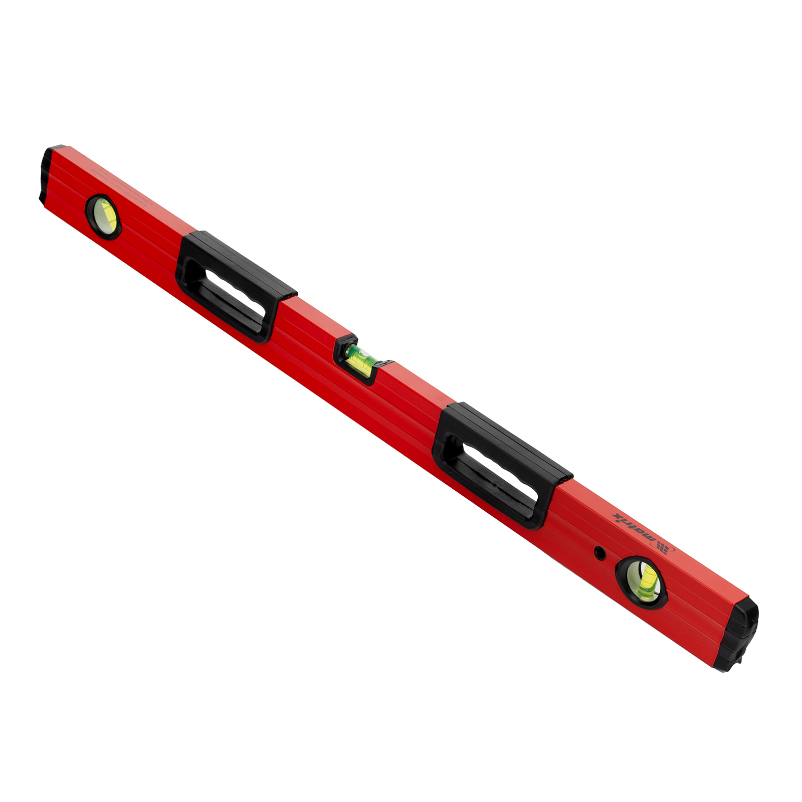 Фрезерованный алюминиевый уровень Matrix 33224 длиной 800 мм, с 3 глазками и 2 эргономичными ручками, поможет проверить горизонтальные и вертикальные поверхности, выставить угол 45 градусов. Он будет полезен на любом этапе строительства и ремонта: при облицовке и отделке поверхностей, монтаже конструкций и т.д. Погрешность измерений на метр не превышает 1 мм (0,057 градуса).,Для определения отклонения вертикали 90 градусов необходимо использовать пузырьковую ампулу только в верхнем положении уровня. Только базовая поверхность является рабочей (противоположная ампуле 180 градусов).