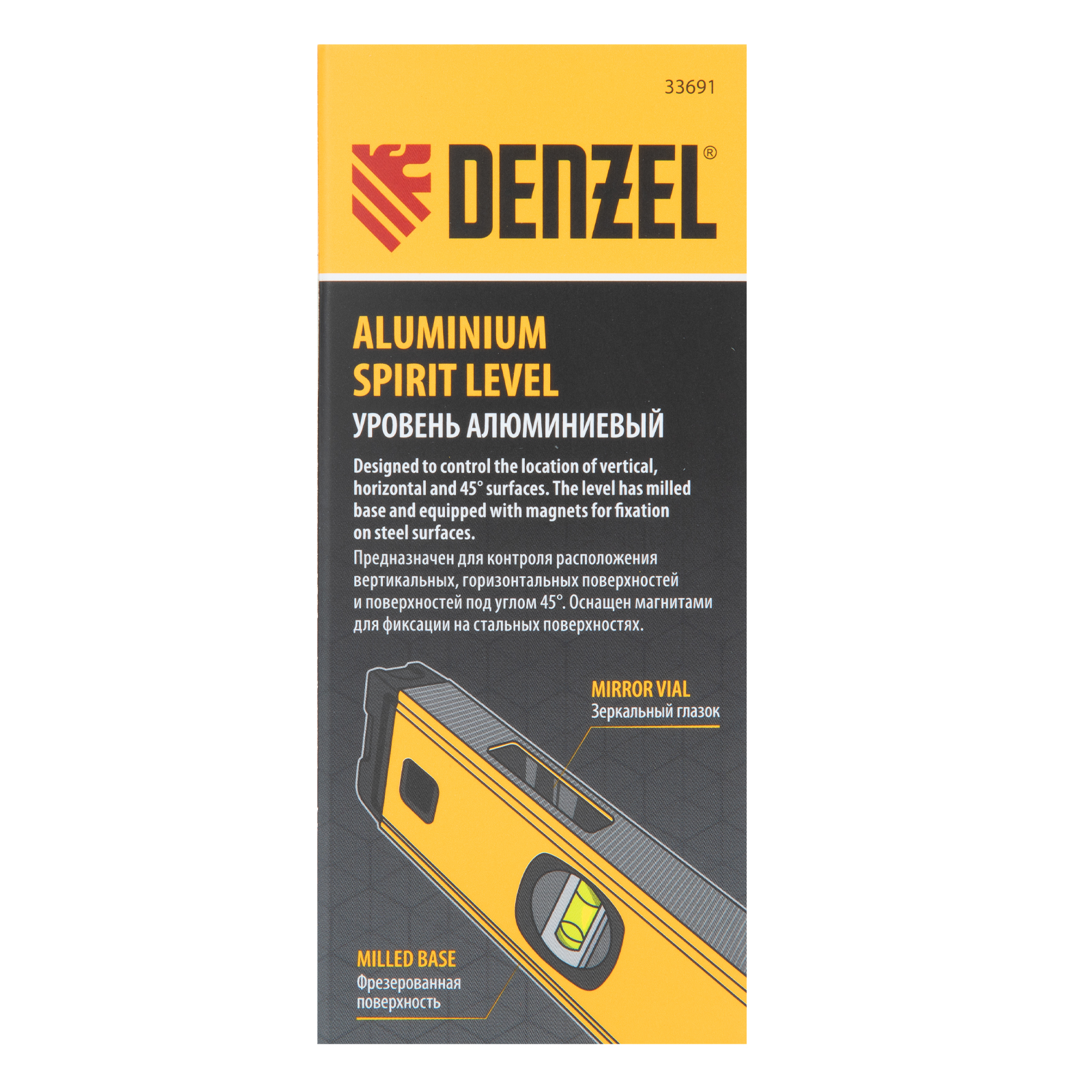 Алюминиевый фрезерованный уровень Denzel 33691 длиной 600 мм, с магнитом и 3 глазками, из которых 1 зеркальный, предназначен для контроля отклонений от горизонтальной, вертикальной и поверхности под углом 45° с точностью 0,5 мм/м. 3 пузырьковые камеры 90°, 180° и 45° позволяют быстро проверить правильность разметки. Инструмент незаменим при проведении строительных, ремонтных, сантехнических работ.
