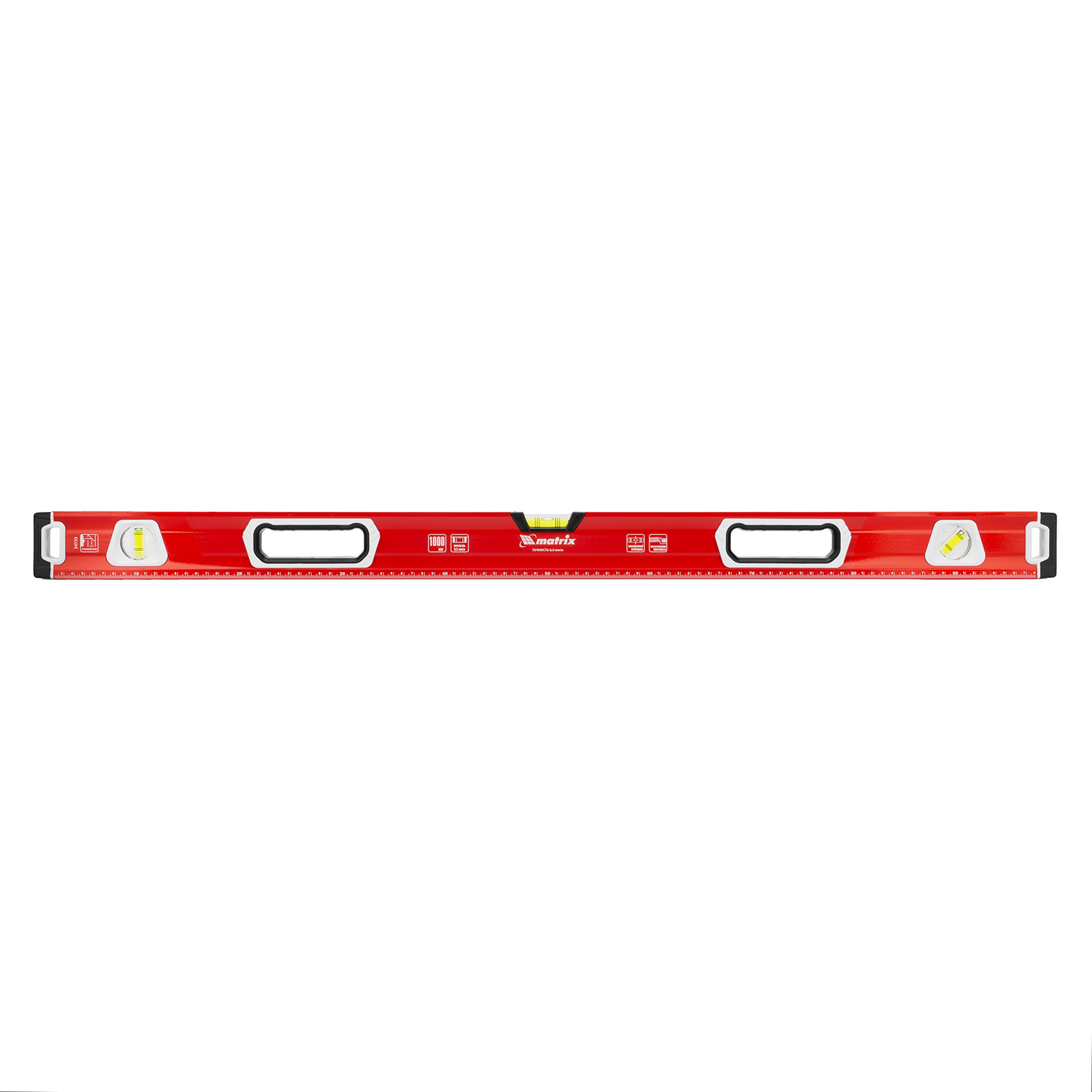 Уровень алюминиевый фрезерованный Matrix 34733 длиной 1000 мм, с магнитной полосой и 2-компонентными рукоятками, 3 глазками и 1 зеркальным отражателем, — измерительный инструмент для контроля отклонений поверхностей от горизонтали, вертикали и угла 45°. Используется для выполнения работ, требующих высокой точности.