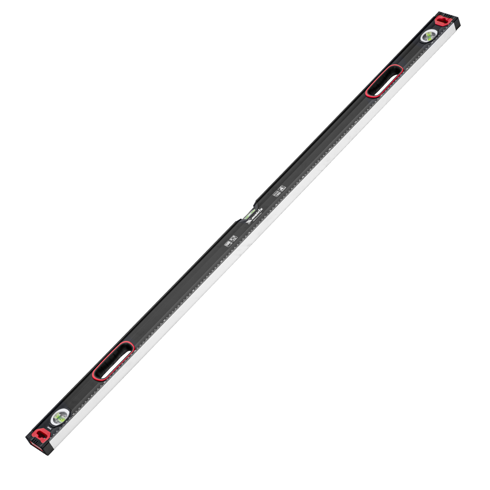 Уровень алюминиевый усиленный Matrix 34365 длиной 1500 мм, фрезерованный, с 3 глазками и двухкомпонентными рукоятками, служит для проверки горизонтальных, вертикальных поверхностей, а также точности угла 45°. Пригодится частному мастеру и профессионалу для проведения строительных, ремонтных и монтажных работ.