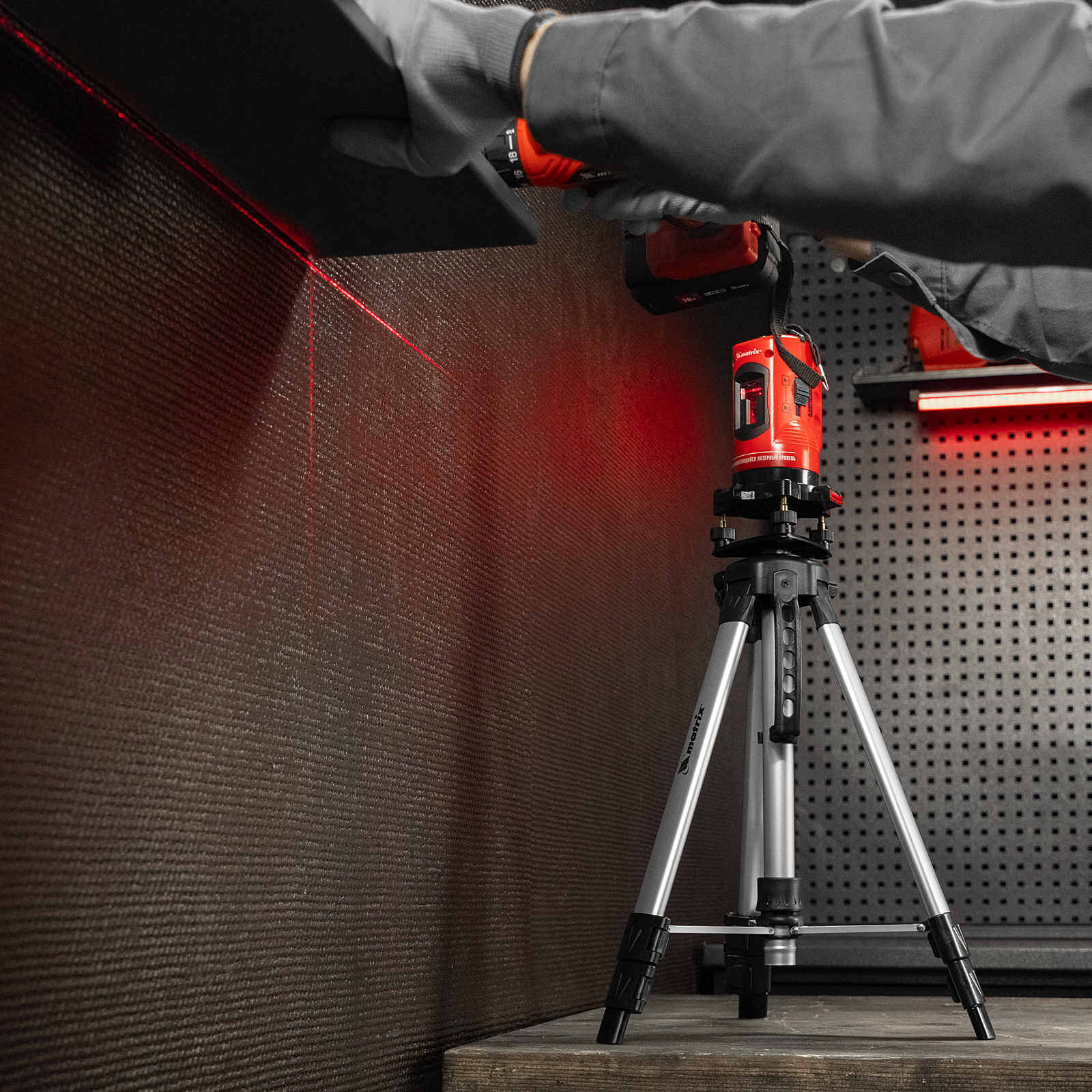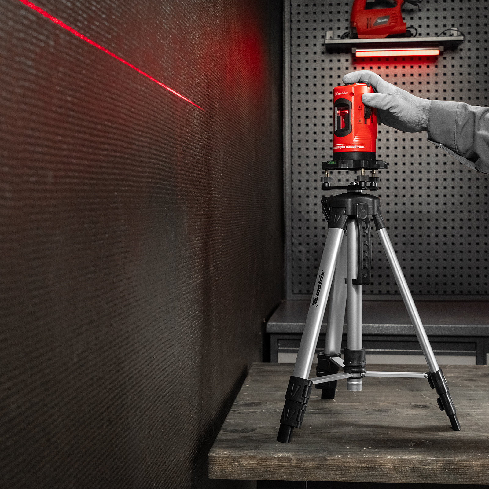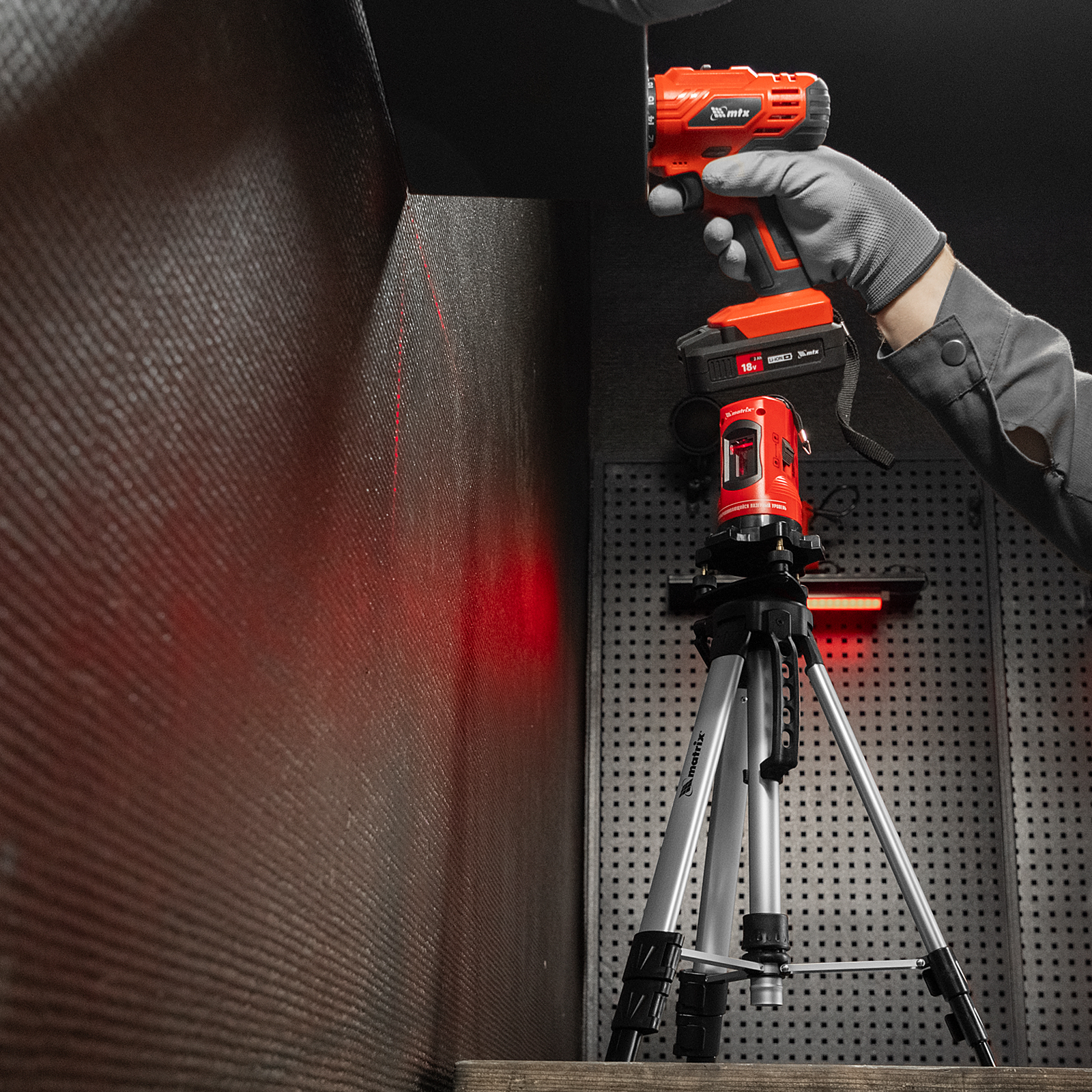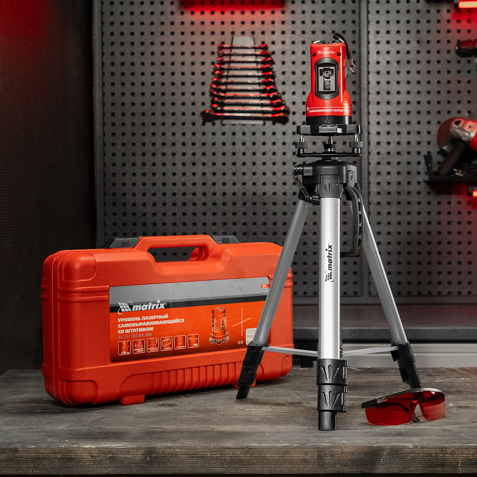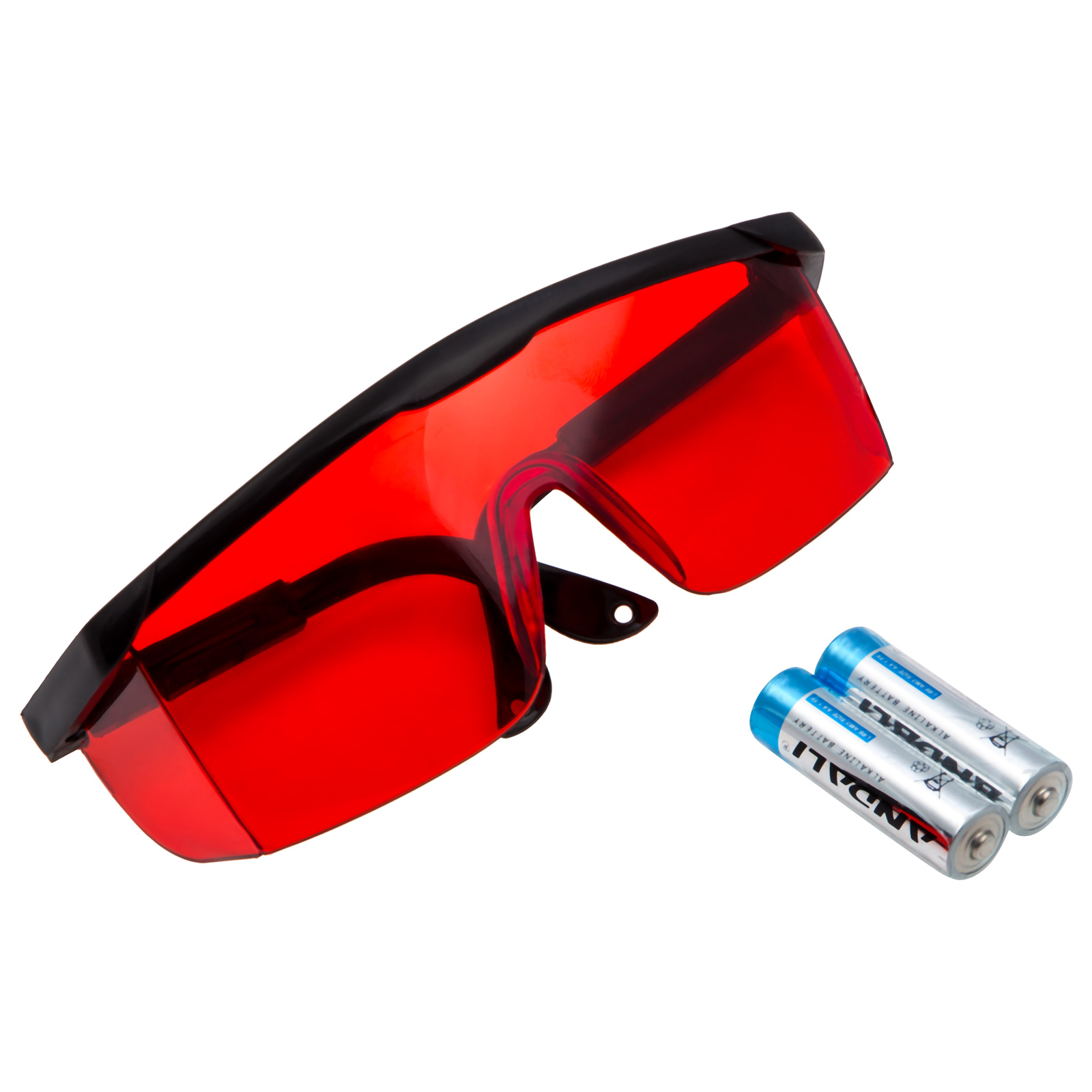 - Защитные очки в комплекте — они блокируют все цвета, кроме красного, улучшая видимость проецируемой линии.