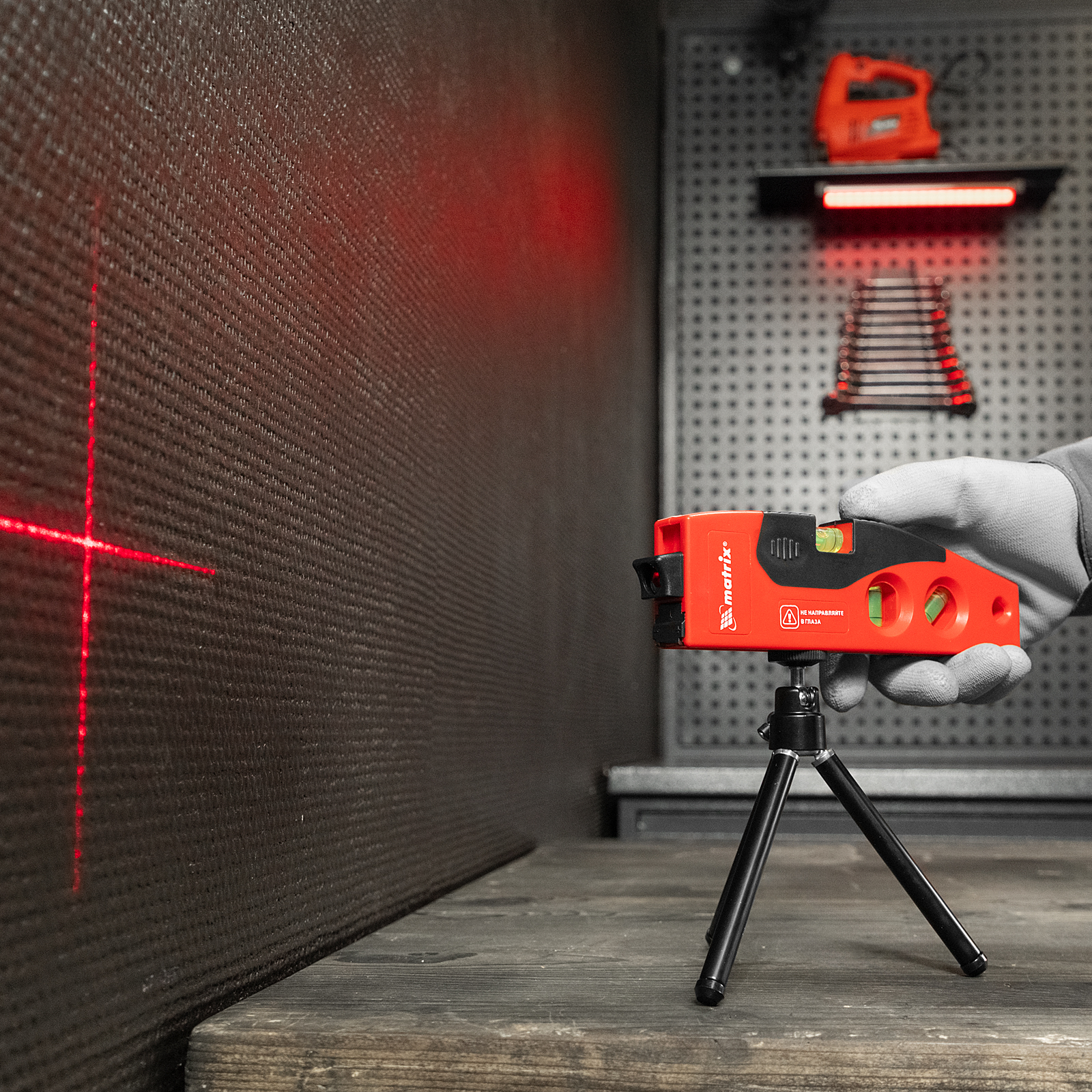 Лазерный уровень Matrix 35022 длиной 180 мм, с 4 глазками и штативом 220 мм, используется для построения разметки во время ремонта и строительства. Позволяет с высокой точностью выполнить установку подвесной мебели, монтаж розеток, выключателей и электроприборов, укладку облицовочной плитки на пол и стены. Дальность проецирования составляет 10 м. Красный цвет луча виден при любом освещении, поэтому уровень подходит для использования как в помещениях, так и на открытом воздухе.