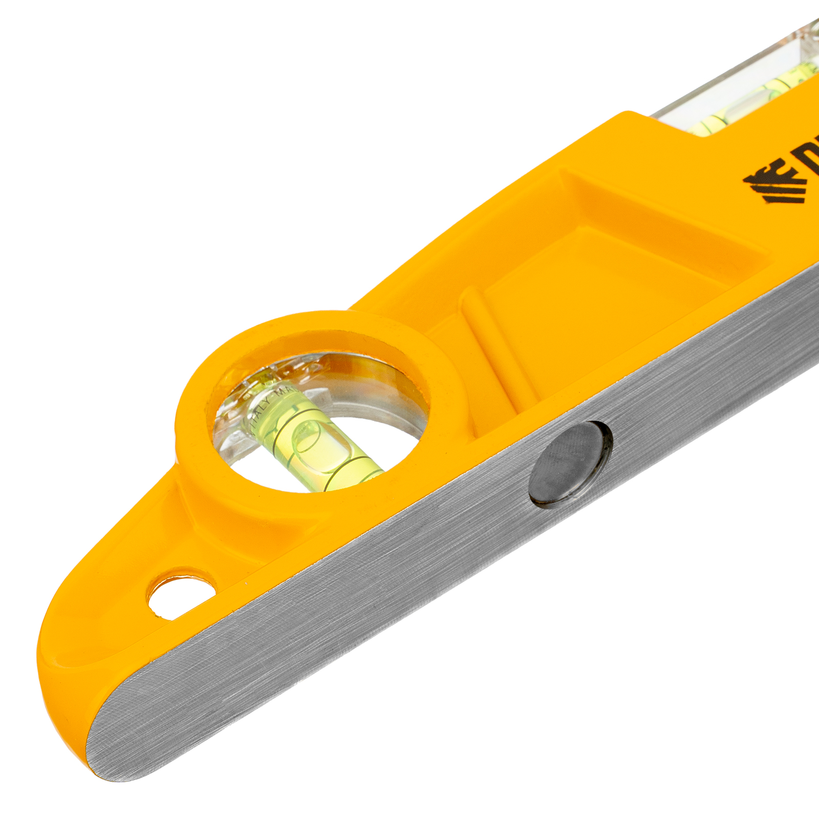 Литой магнитный уровень Denzel 34920 длиной 300 мм, с 2 глазками, поможет создать ровные линии в горизонтальной и вертикальной плоскостях. Строительный уровень обеспечивает высокоточную работу и используется при укладке напольной и настенной плитки, выравнивании кирпичной кладки, брусчатки и т.д.,Для определения отклонения вертикали 90 градусов необходимо использовать пузырьковую ампулу только в верхнем положении уровня. Только базовая поверхность является рабочей (противоположная ампуле 180 градусов).