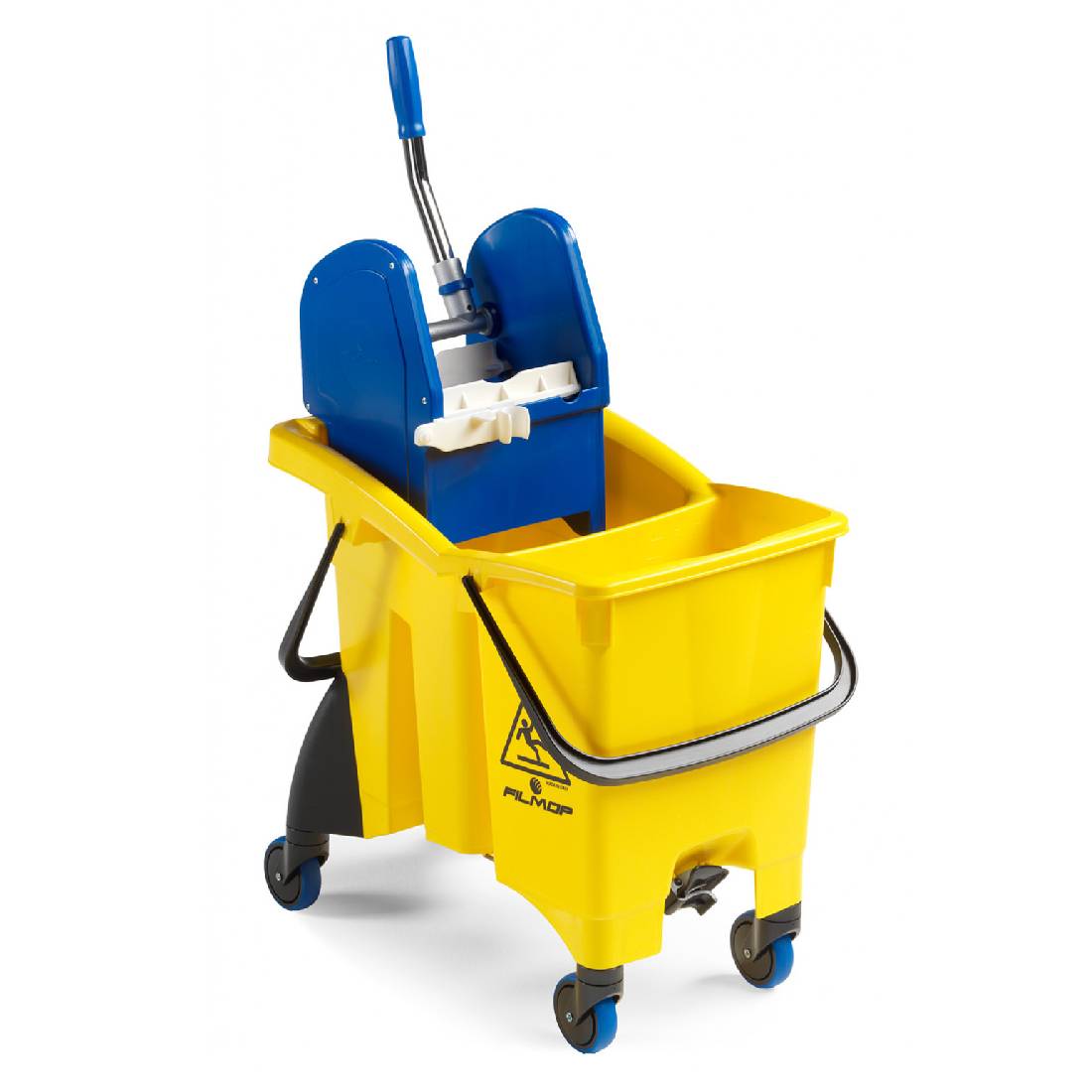 Ведро тележка с двумя секциями предназначено для влажной уборки и мытья полов в помещениях малой площади. Ведро имеет ударопрочную полипропиленовую раму с прорезиненными колёсиками. Емкость ведра 30 л.
