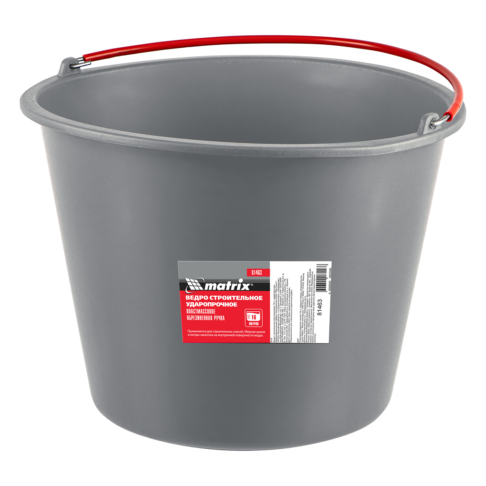 Ударопрочное пластмассовое ведро Matrix 81463 объемом 16 л, с обрезиненной рукояткой, используется во время проведения строительных и отделочных работ. В нем можно замешивать строительные растворы, хранить и перемещать жидкие и сыпучие материалы. На внутренней поверхности имеется шкала, позволяющая отмерять необходимое количество раствора.