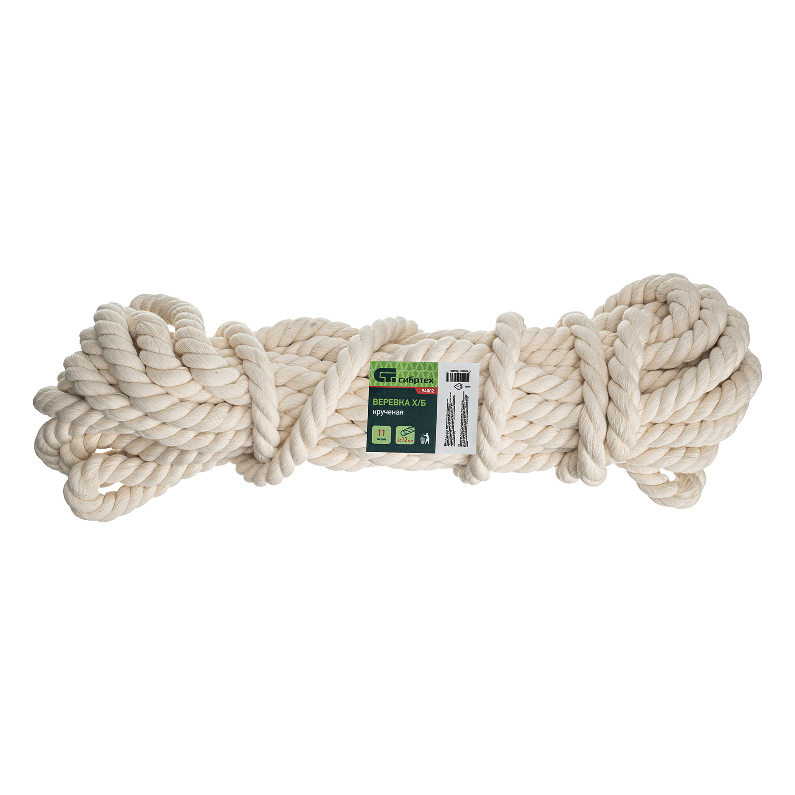 Крученая х/б веревка Сибртех 94002, 12 мм, L 11 м, используется в домашнем хозяйстве и для грузоперевозок, а также в садоводстве, туризме, промышленности. Благодаря толщине 12 мм изделие обладает необходимой прочностью.